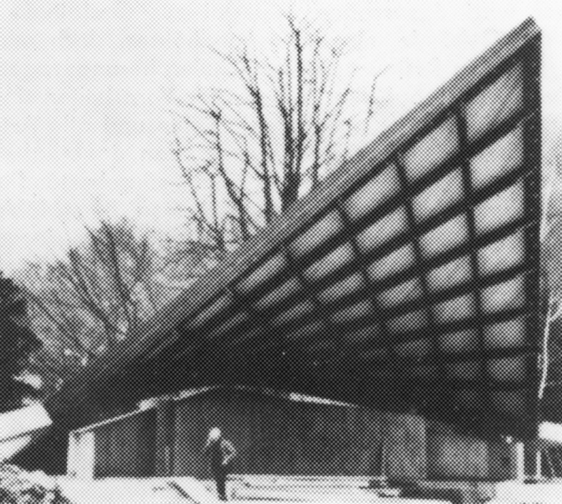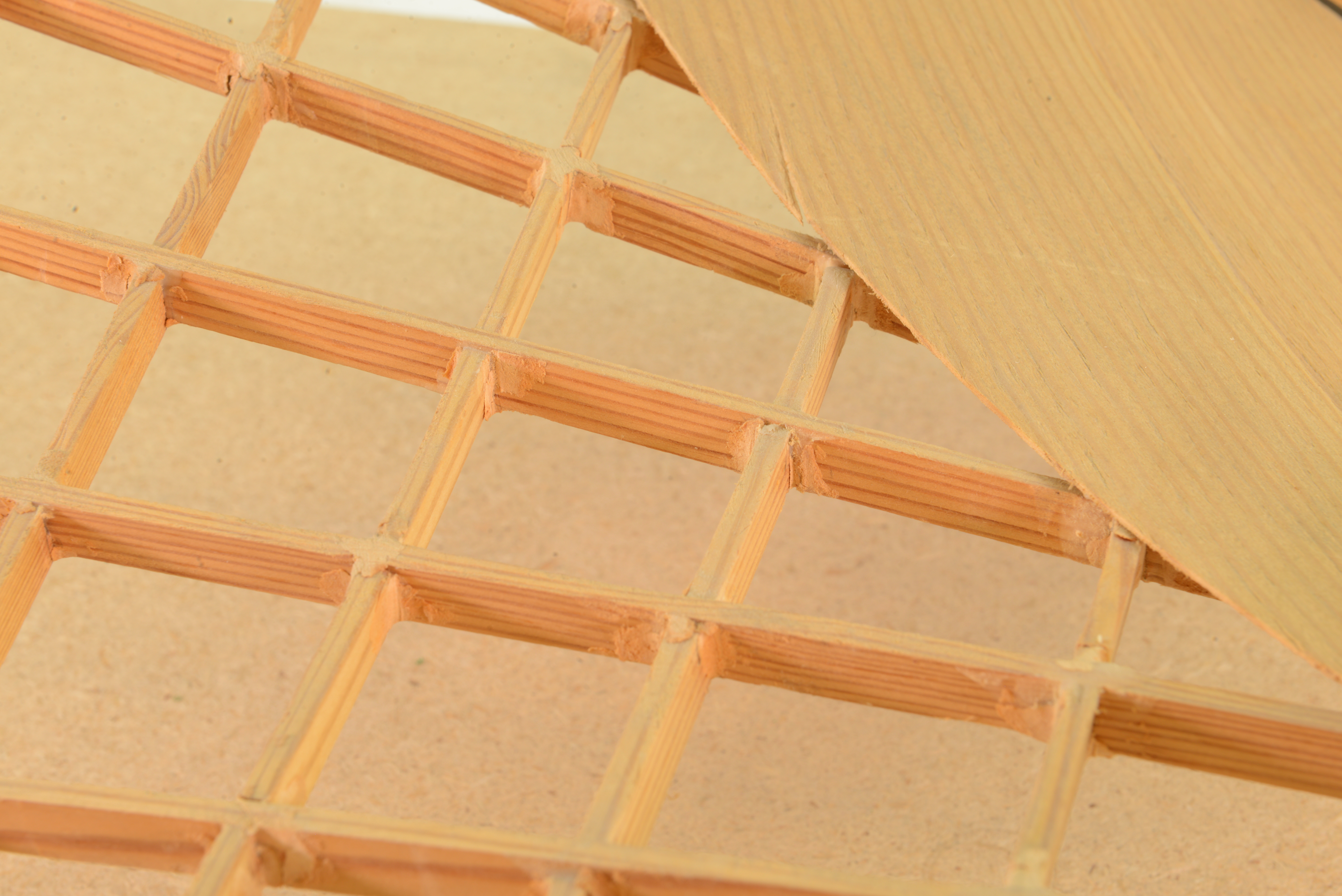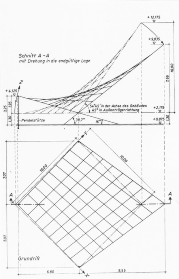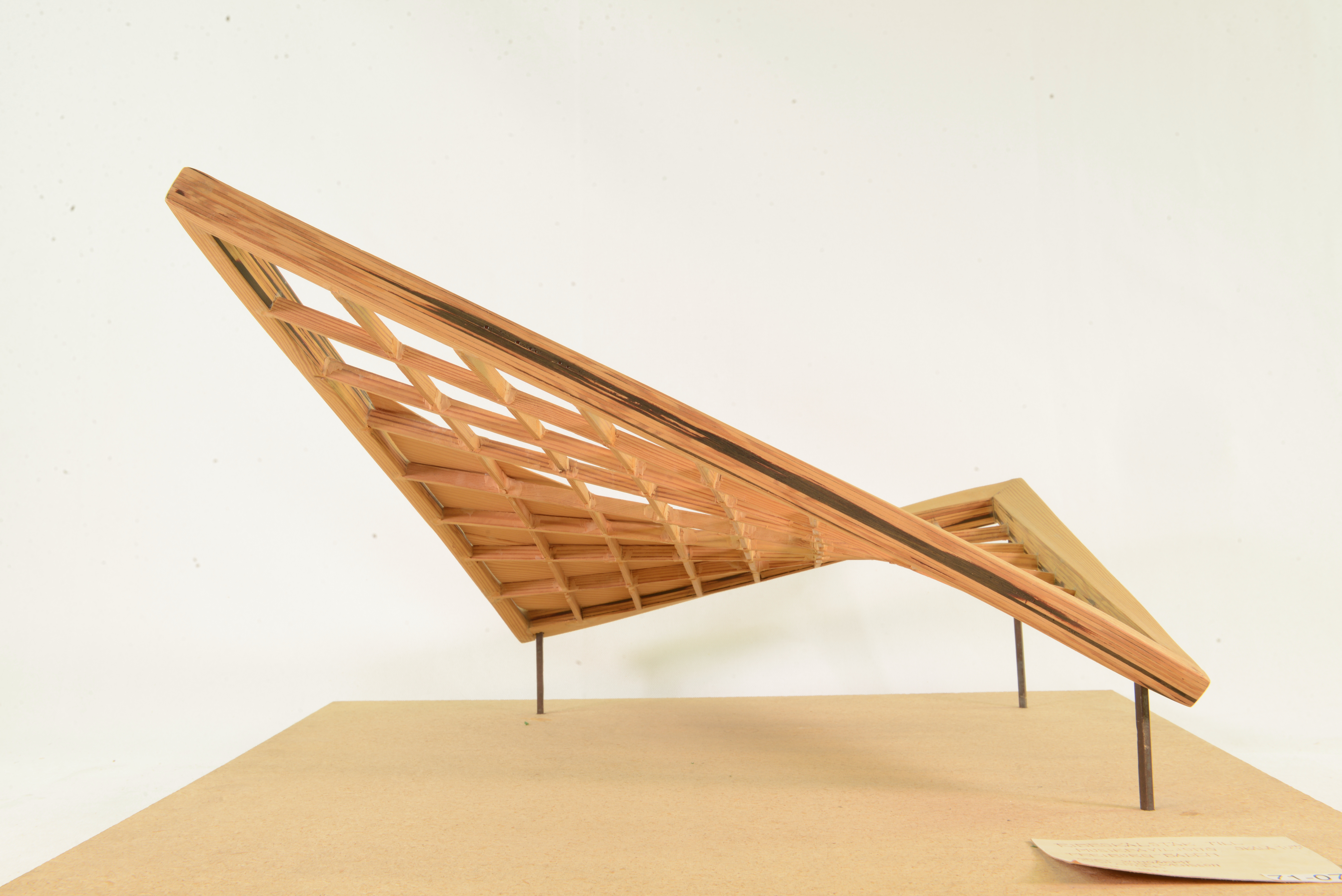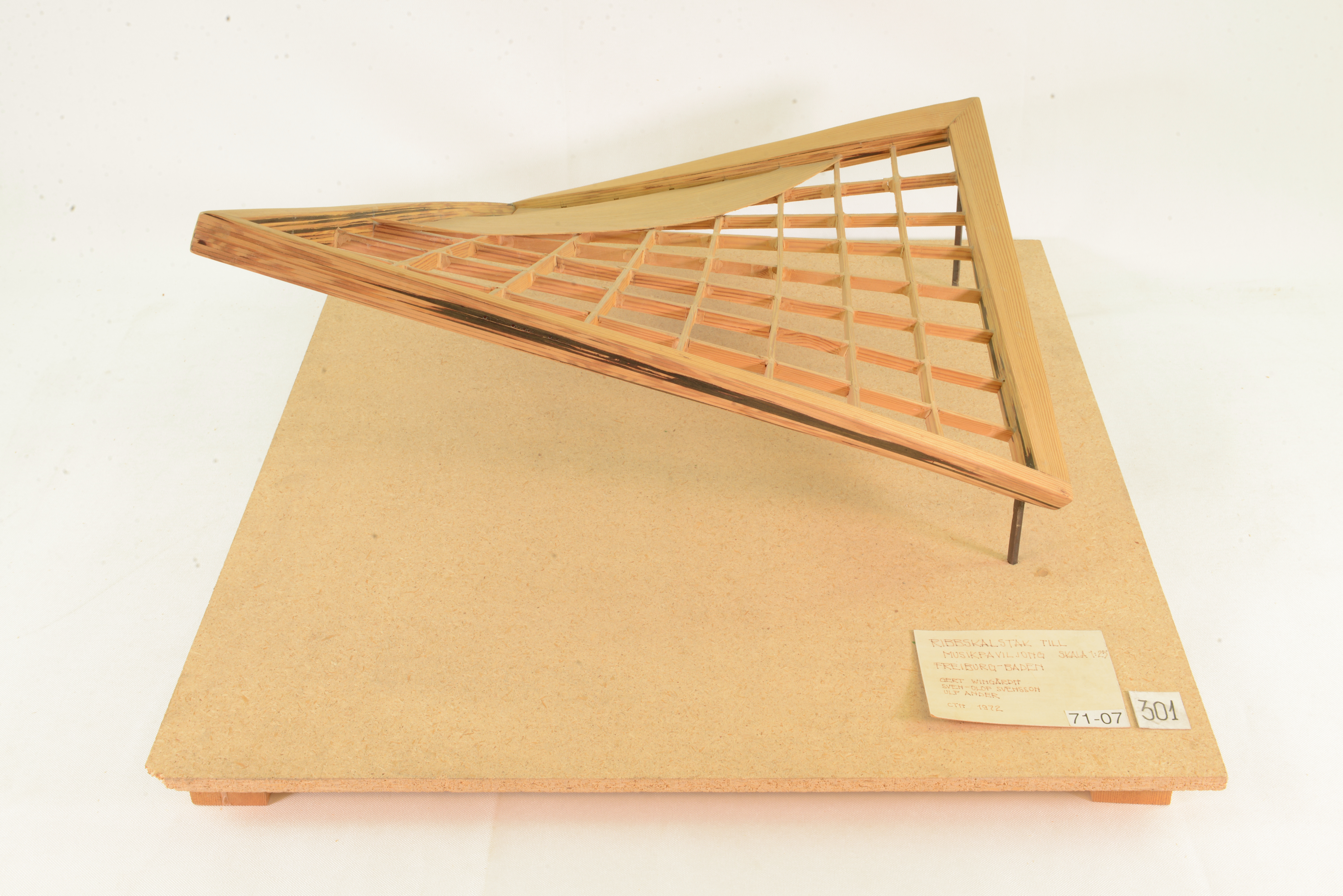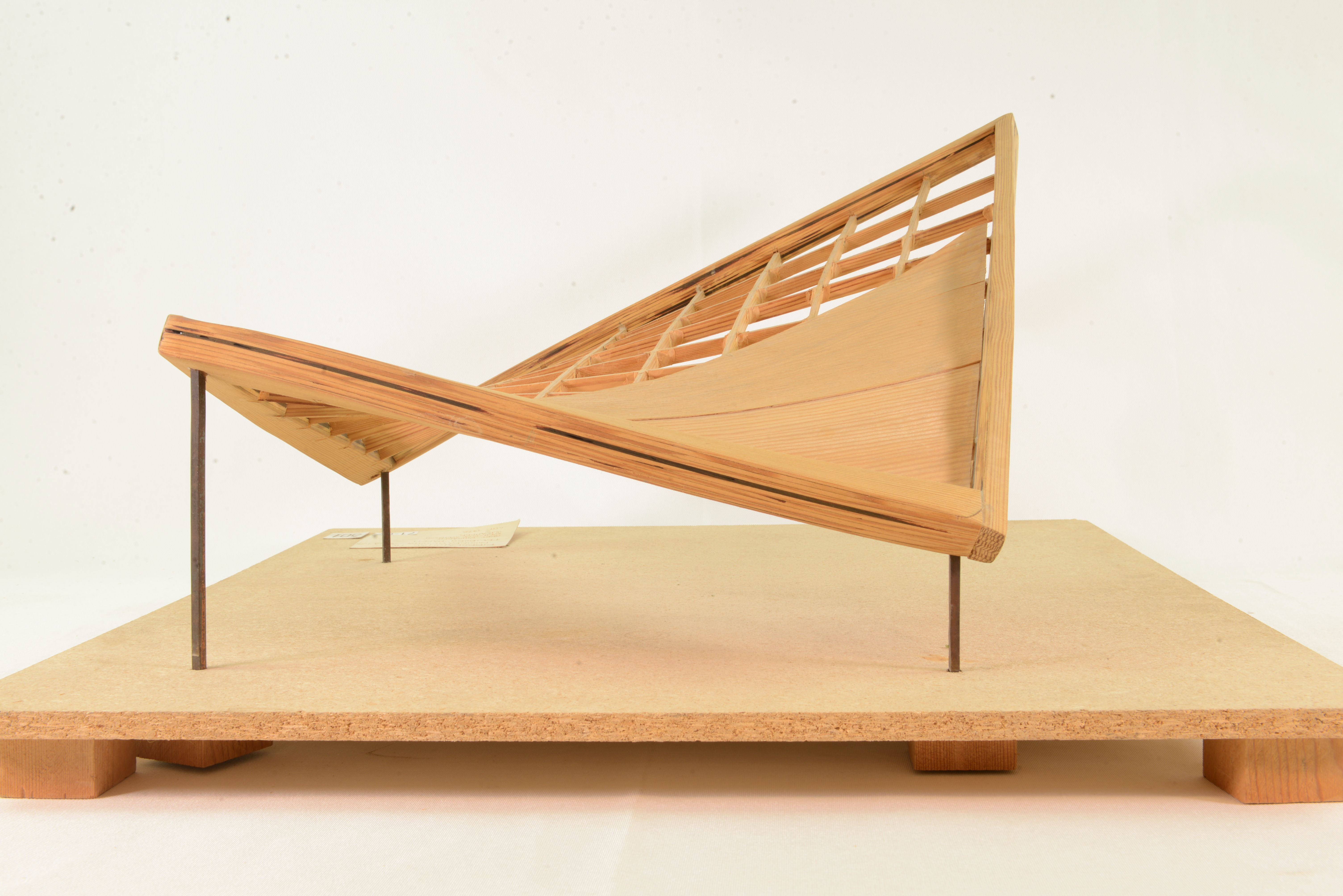Modellen visar ett skaltak över en musikpaviljong, byggd 1969 i Freiburg-Baden i Tyskland. Taket har formen av en hyperbolisk parabeloid med markprojektionen av en kvadrat på 10 x 10 m. Taket stöder mot två stöd, som formats som en förlängning av ramen. Vid den lägsta högpunkten finns ett pendelstöd, för att hålla konstruktionen i läge vid ensidiga belastningar. Ram och ribbor av limträ är vridna, för att möta det överliggande flerlagriga skaltaket vinkelrätt.