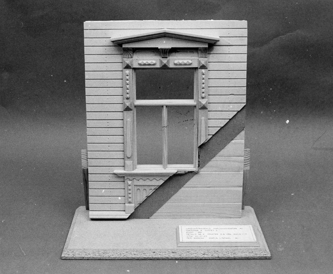 Modellen visar hur en vägg, papp, fönster, drevning och fönsteromfattning är sammanfogade i ett fönsterparti en trappa upp, i ett landshövdingehus på Karl Johansgatan 42. Omfattningen är typisk för den klassicerande landshövdingehusarkitekturens rika men stränga utformning.