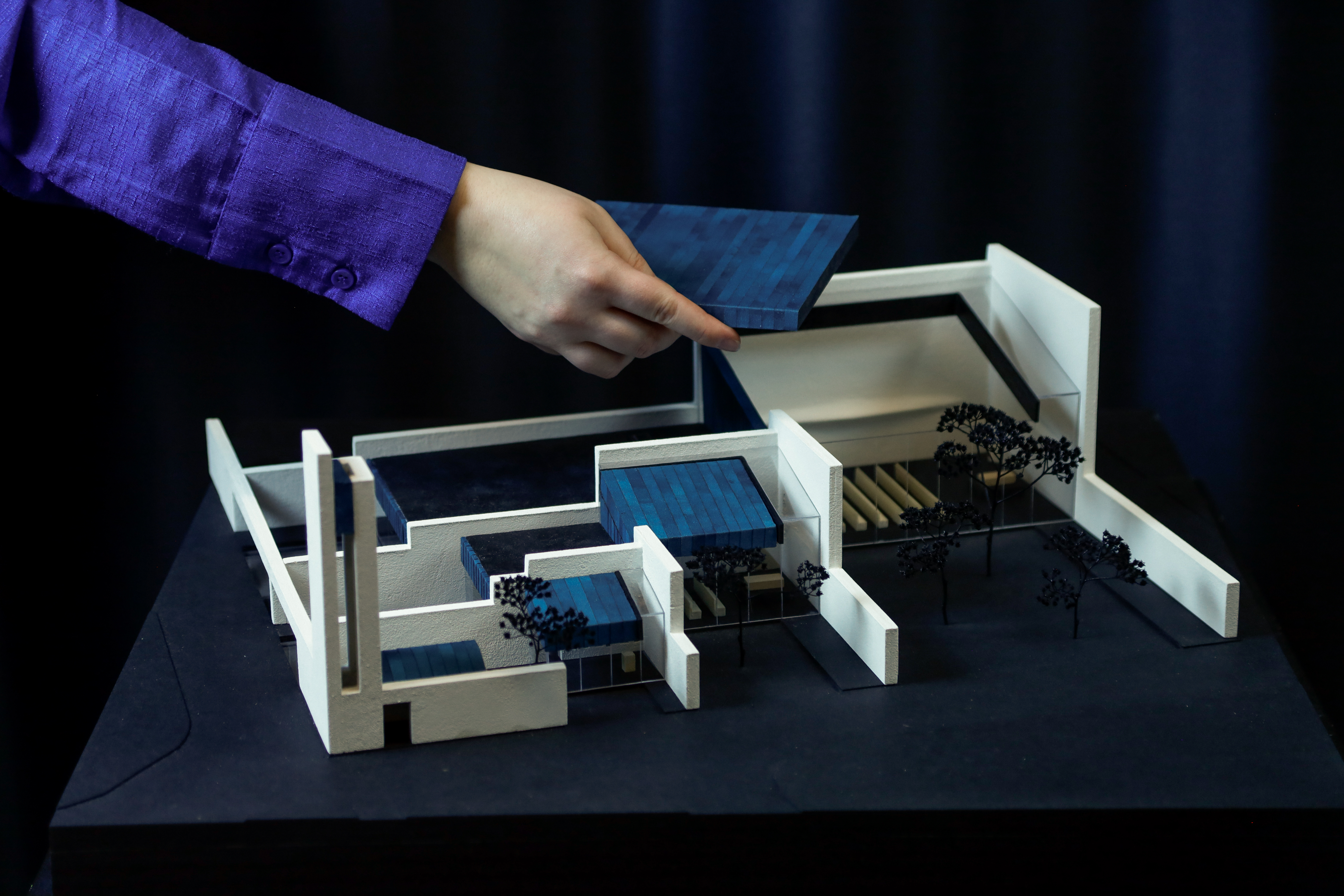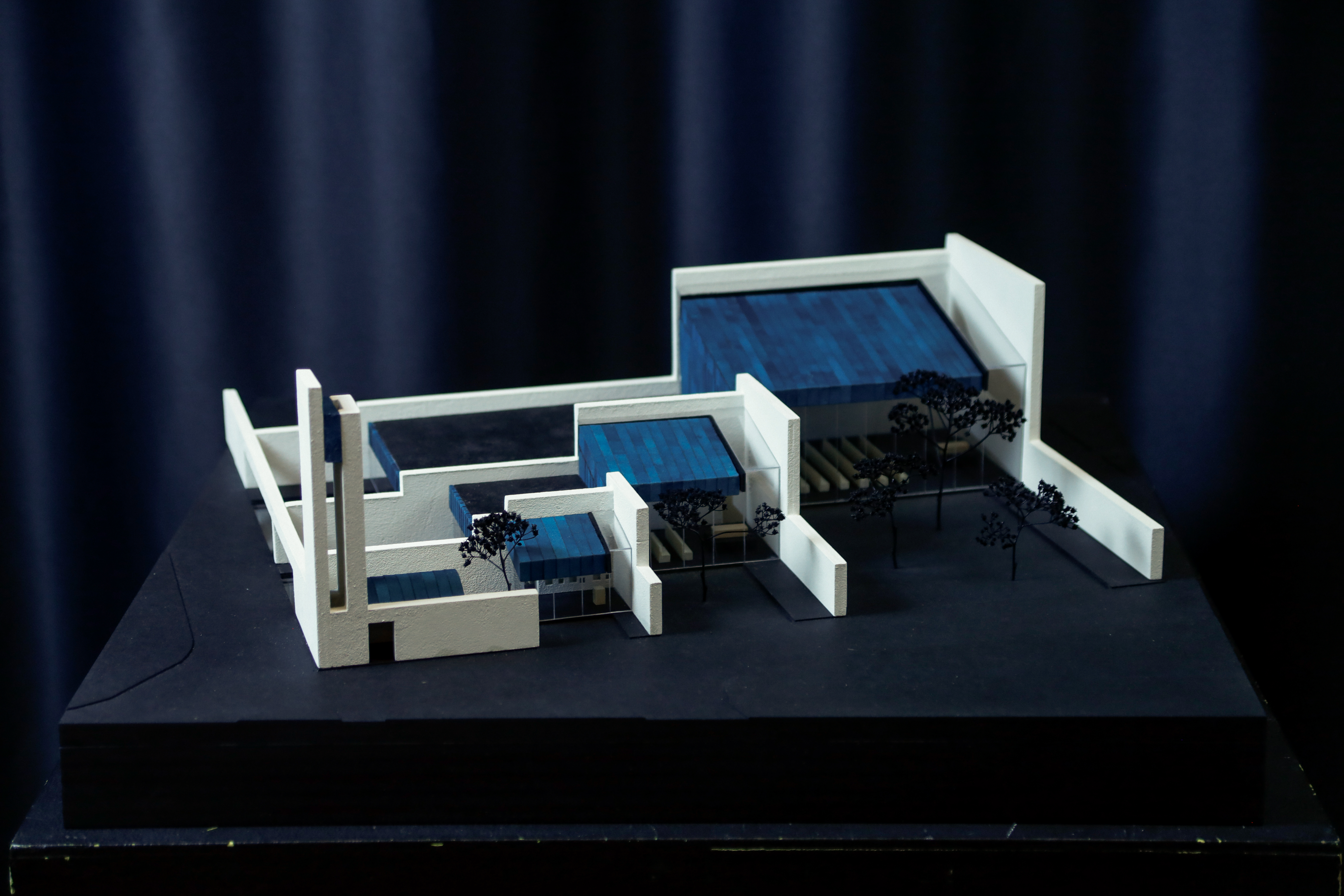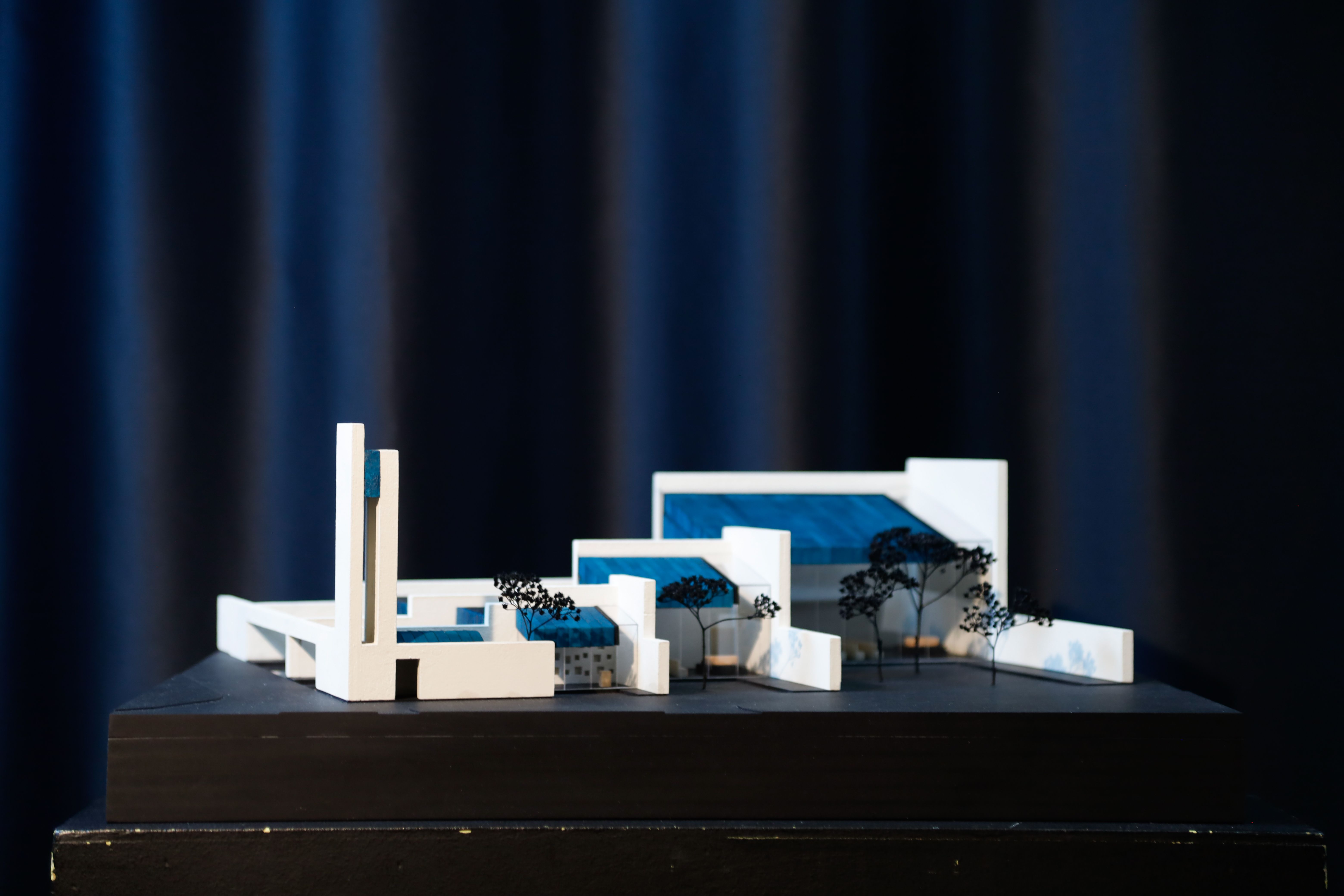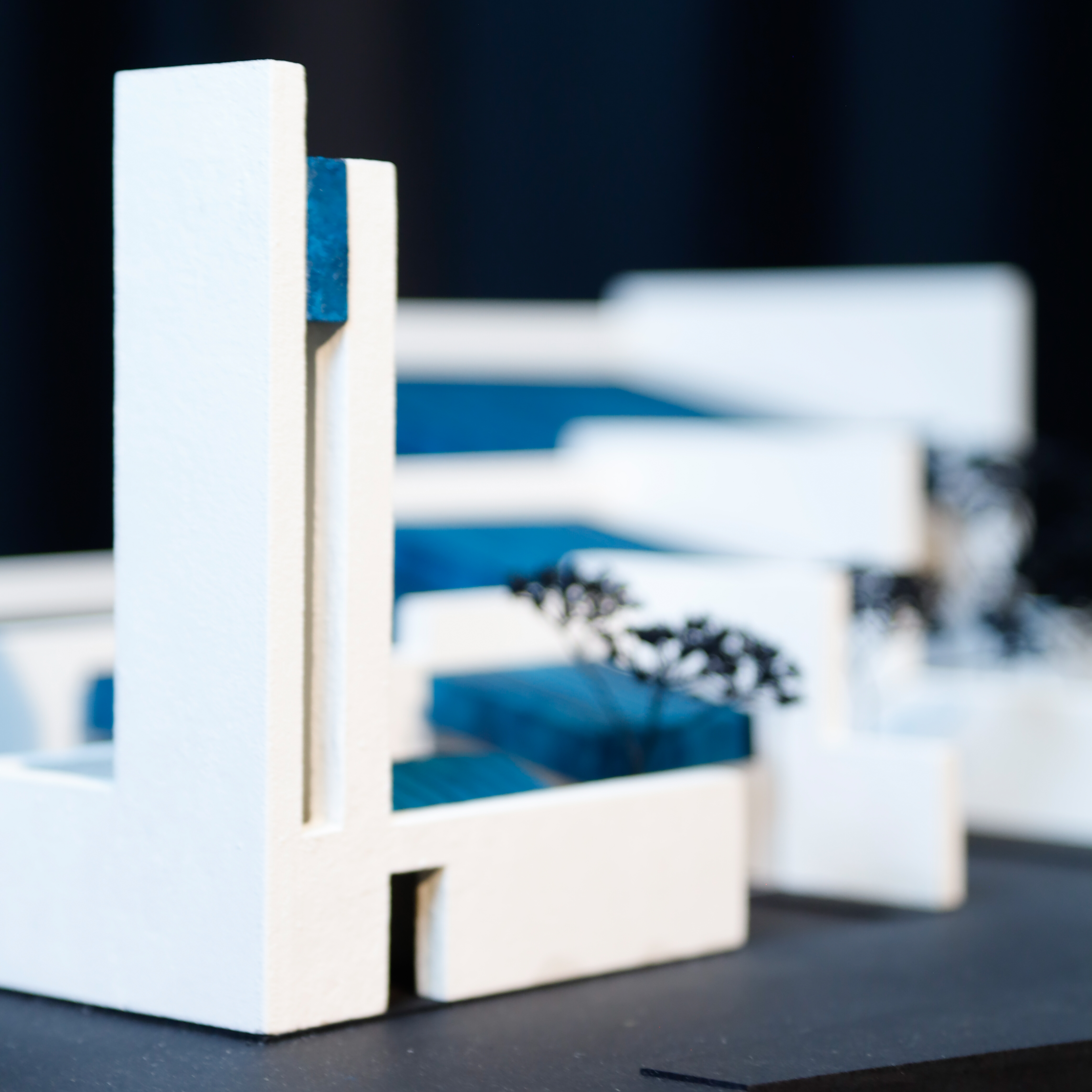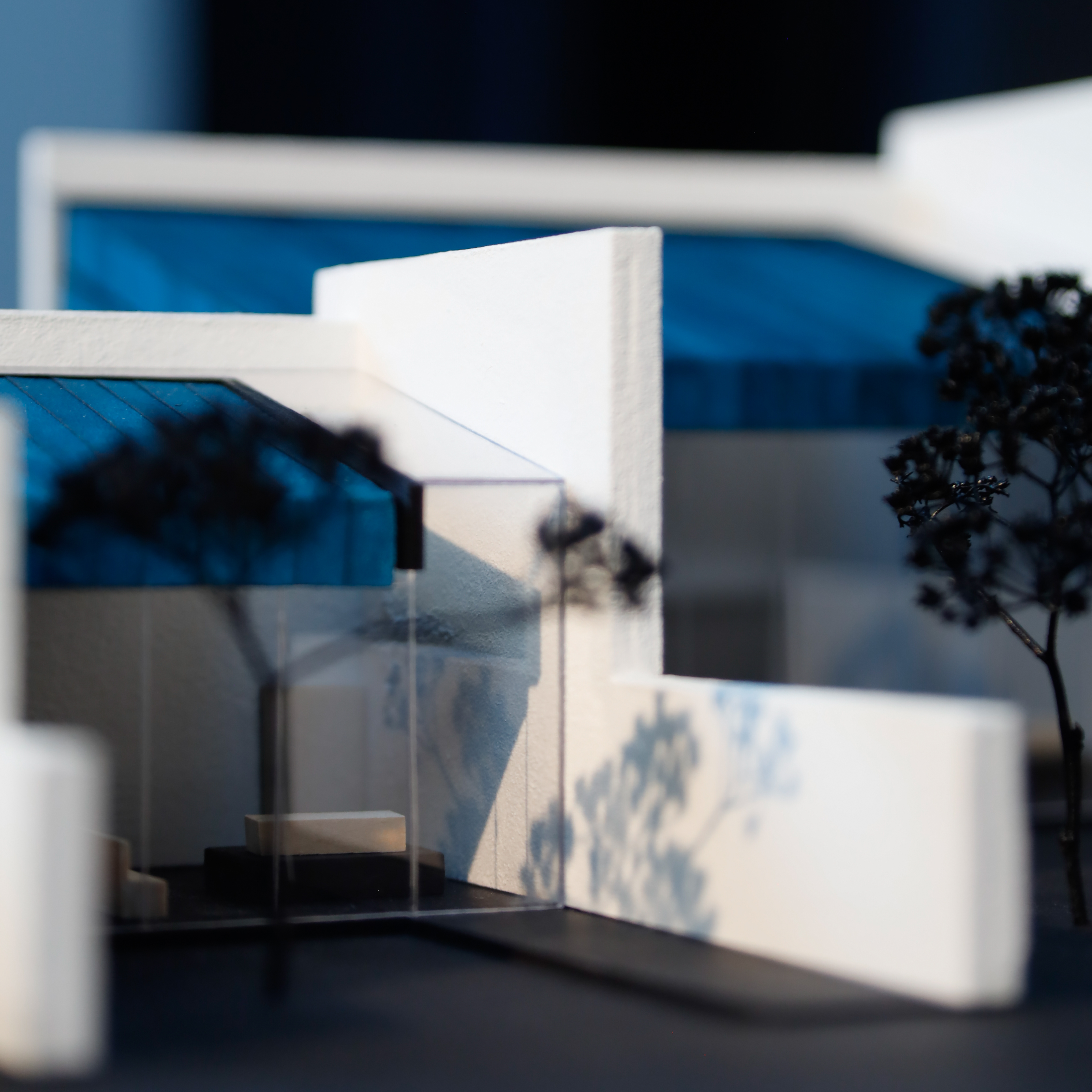 Base | anthracite Valchromat MDF-boards, Walls | painted Balsa-wood sheets, Windows | PET plastic sheets, Roofing | turqoise painted sanding paper, Ponds | Acrylic glass sheets, Trees | black painted shrub-branches