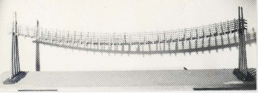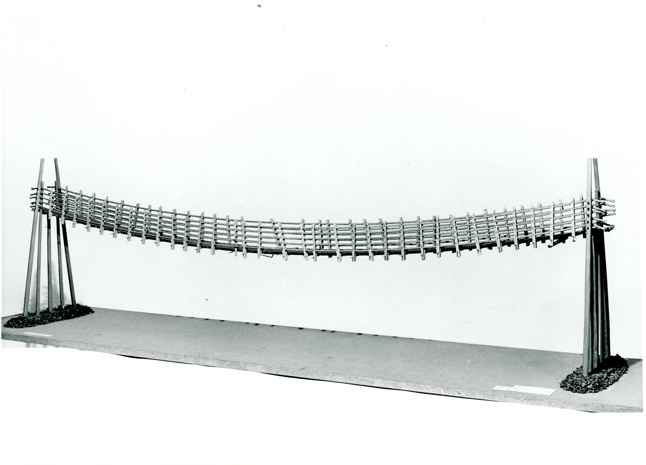 Modellen visar ett spann i en flerspannig gångbro över floden Min i provinsen Szechuan i Kina. Bron är byggd på 1930-talet men konstruerad som de allra äldsta hängBroara. Repen är tvinnade av spjälkad bambu. Träpålarna har spåntak till skydd mot väder och vind. Gångbanan ligger direkt på repen. Förutom växtmaterial har järnkedjor också använts i hängBroara i Kina, från år 65 enligt traditionen.