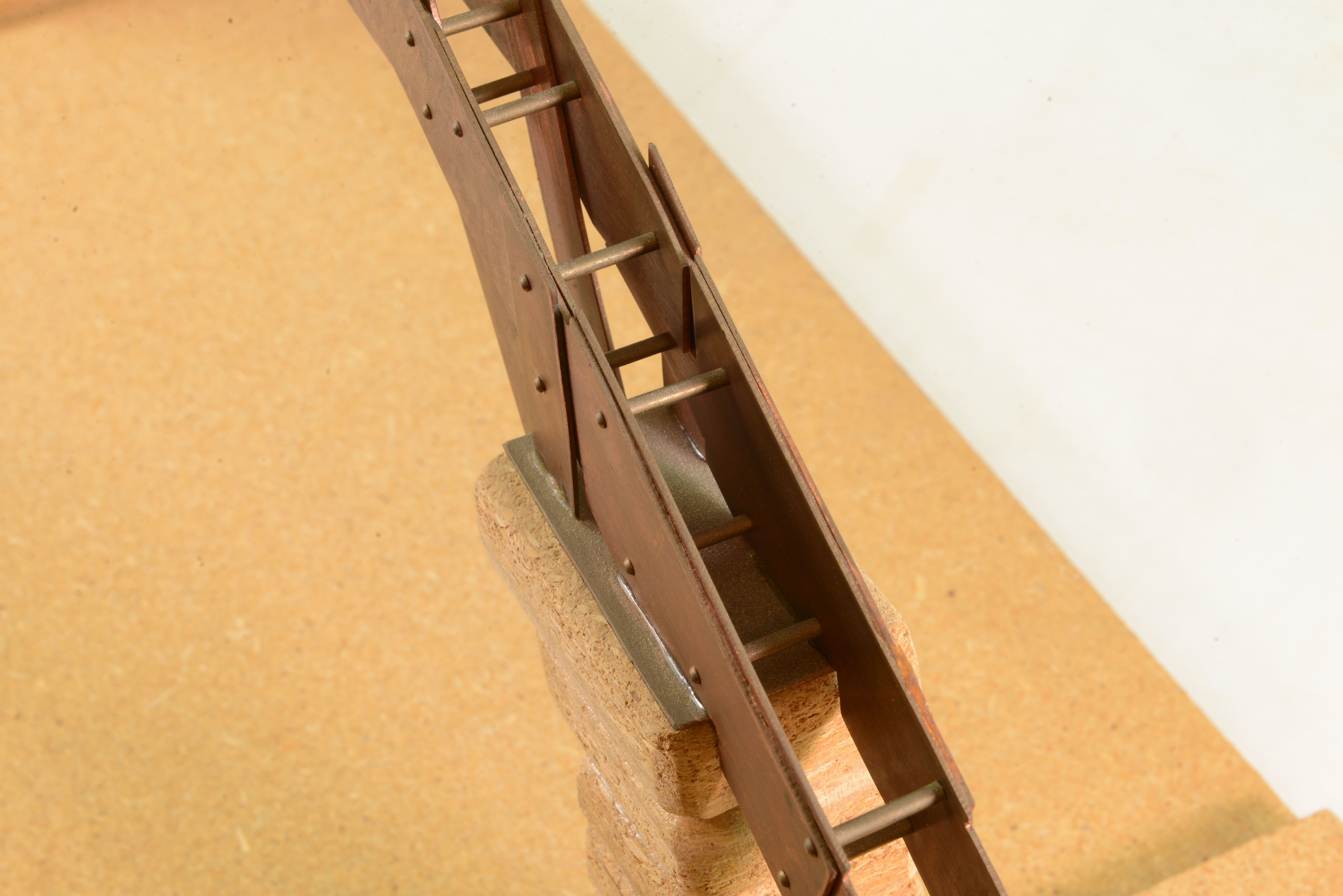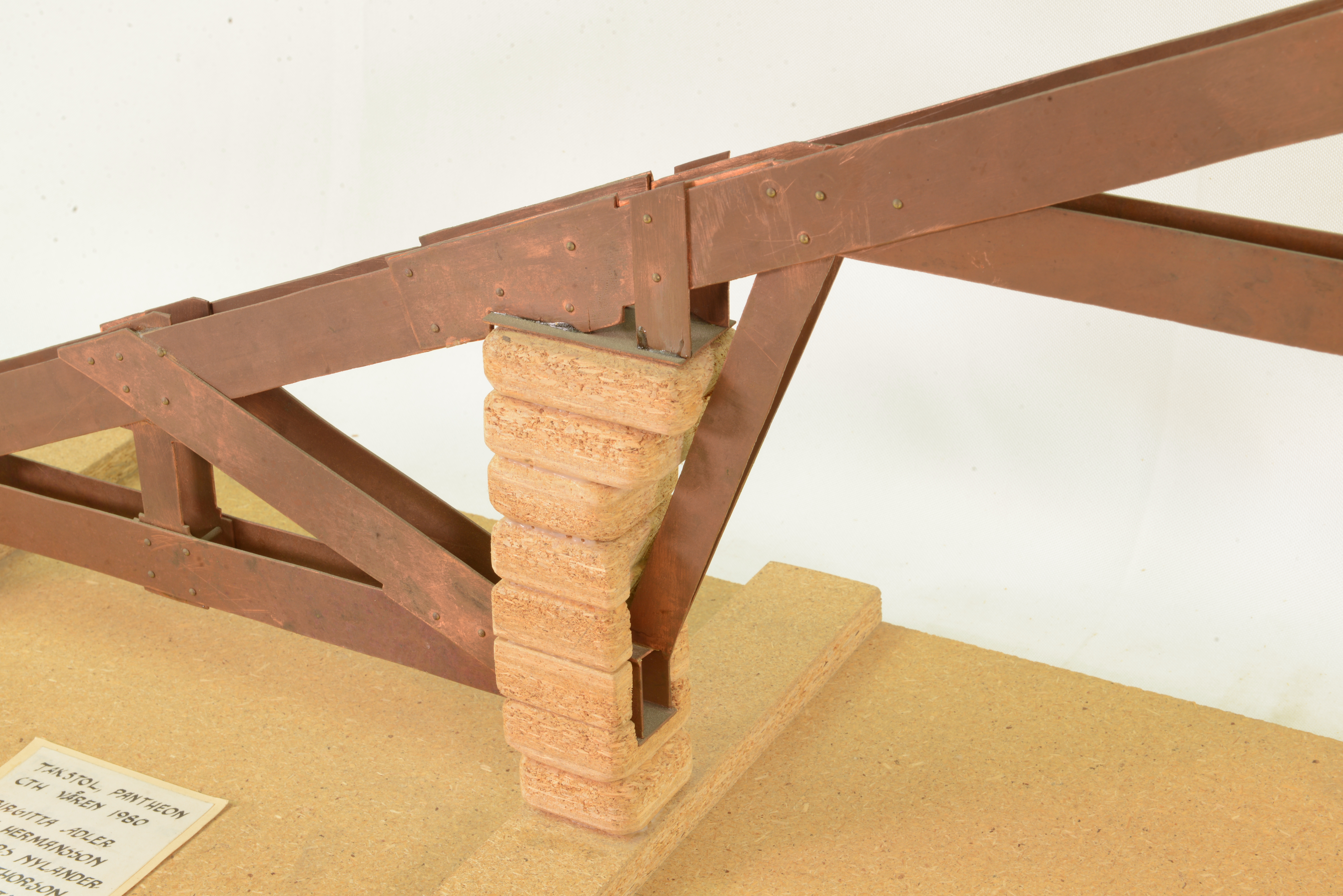 Pantheon i Rom uppfördes under kejsar Hadrianus omkring åren 117-128 e Kr. Byggnaden består av tre delar; en förhall, en mellandel och det kupoltäckta rummet (se även modell 141). Förhallens takstolar var ursprungligen en konstruktion av sammannitade bronsskivor. Bronstakstolarna byttes ut mot takstolar i trä och smältes ner under restaureringsarbetena 1618. Francesco Borromini, som då var anställd hos Carlo Maderna gjorde då bl a den uppmätning, som är underlag för denna modell.
