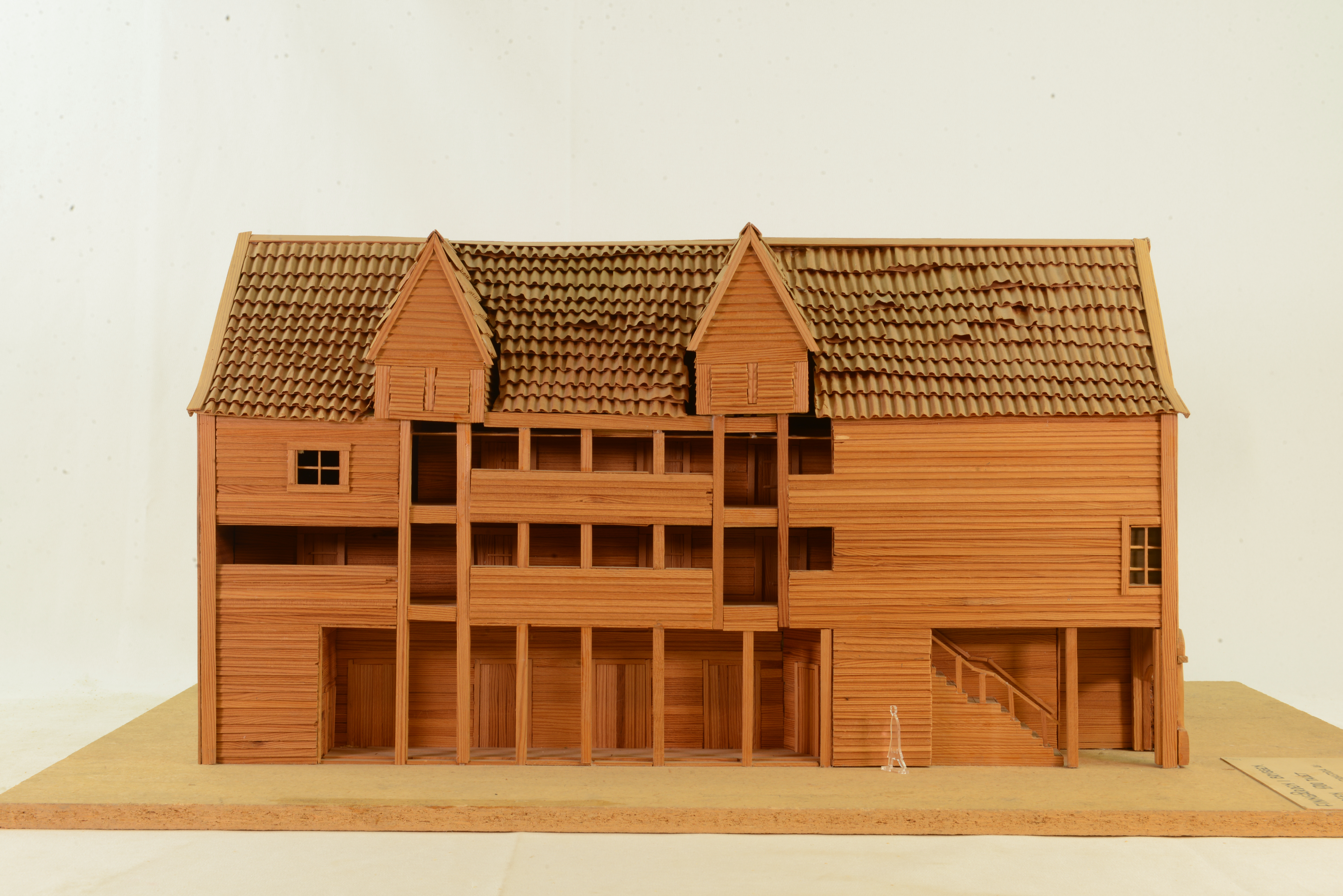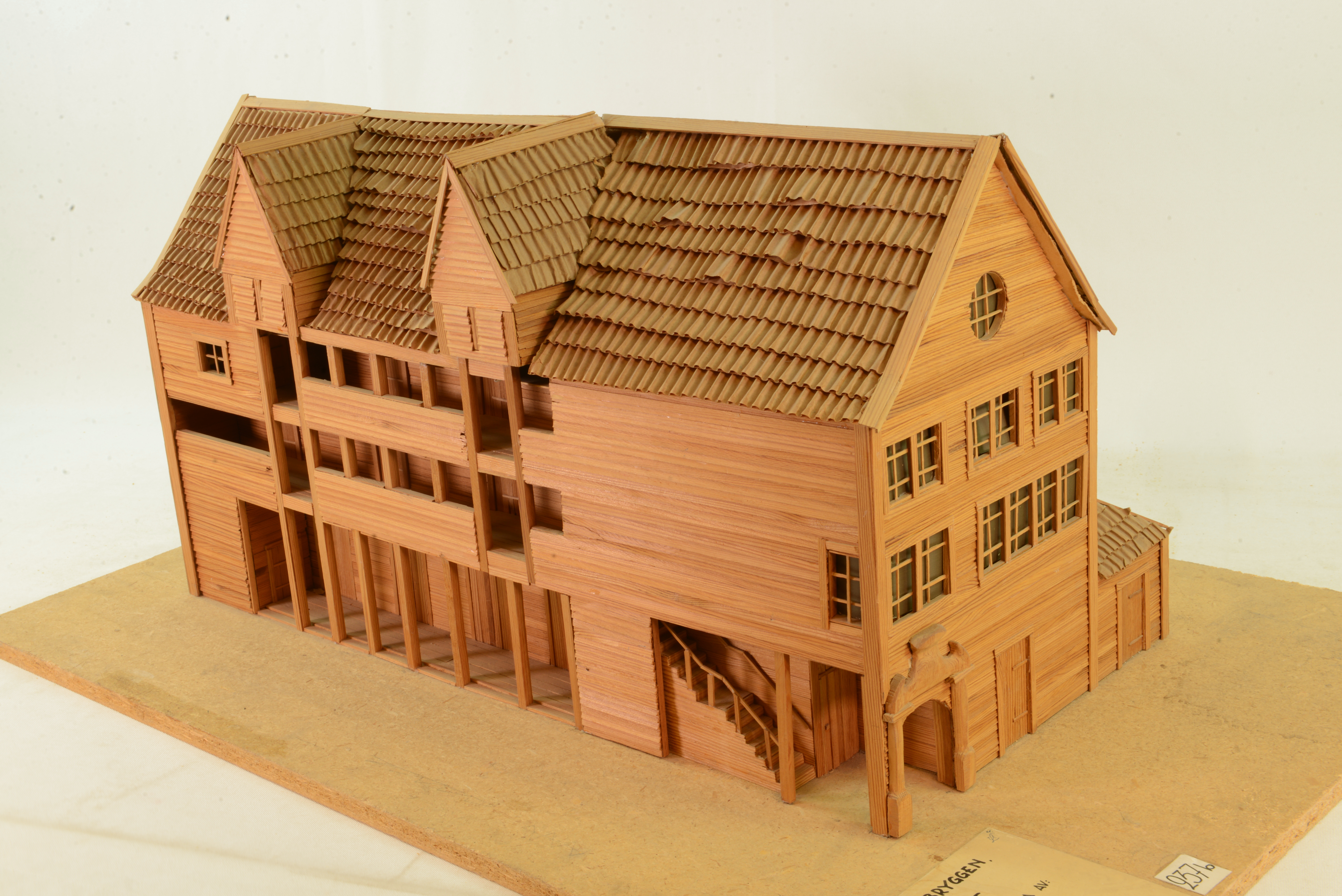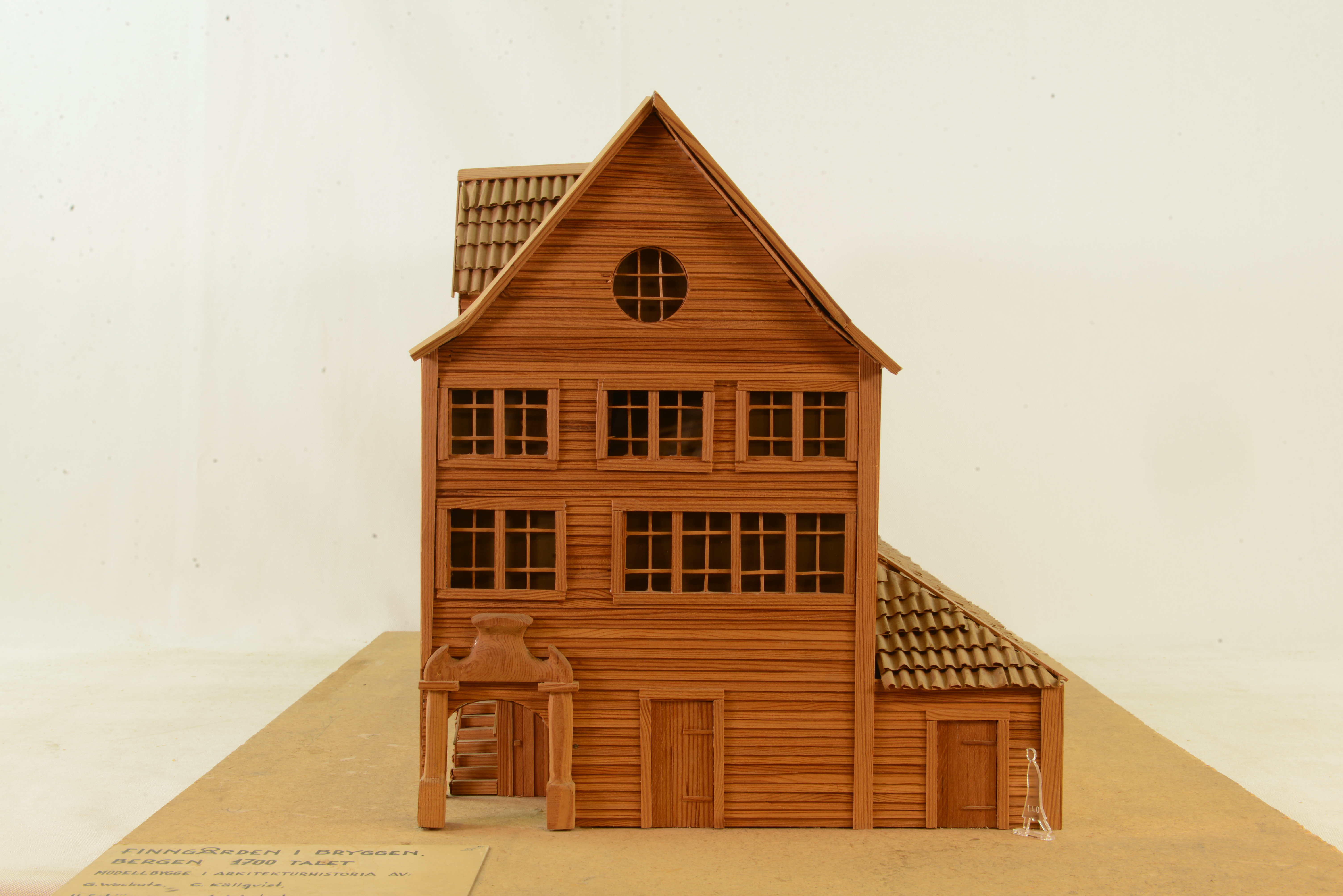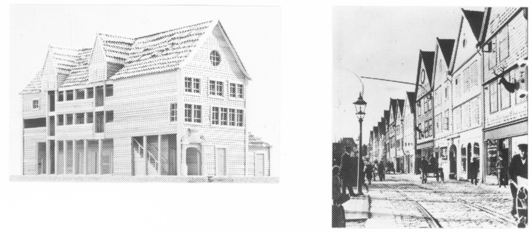 I Bergen har de tyska handelsgårdarna starkt präglats av den norska byggnadstraditionen.Finngården byggdes av fem köpmän efter branden 1702. Alla gårdar vid Tyskebryggen är byggda efter ungefär samma mönster. Handelshus och uthus ligger på ömse sidor om den smala gränden som sträcker sig mellan gatan och hamnen. Köpmännen ägde gemensamt brygga, schøtstue (för måltider och samvaro) coh eldhus (där all mat lagades). Handelshusen innehåller förråds- och boningsrum och är helt oeldade. Stuen är husets huvudrum varifrån husbonden styrde sitt hus. Inrestuen var husbondens vinterbostad. Tyskarna måste leva ogifta och gårdarna befolkades följaktligen mest av män. Svalgången i mellanvåningen leder upp mot schøstuen. Modellen visar ett av handelshusen mot hamnen. Det var finast med gavelfasad med fönster och stora rum. Huset inrymmer nu det Hanseatiske Museum.