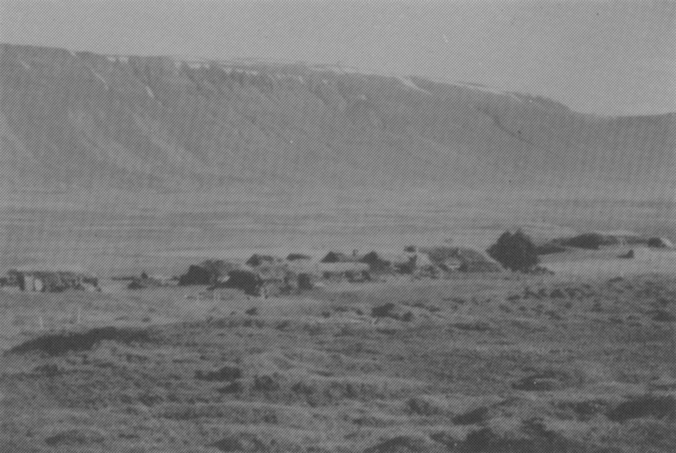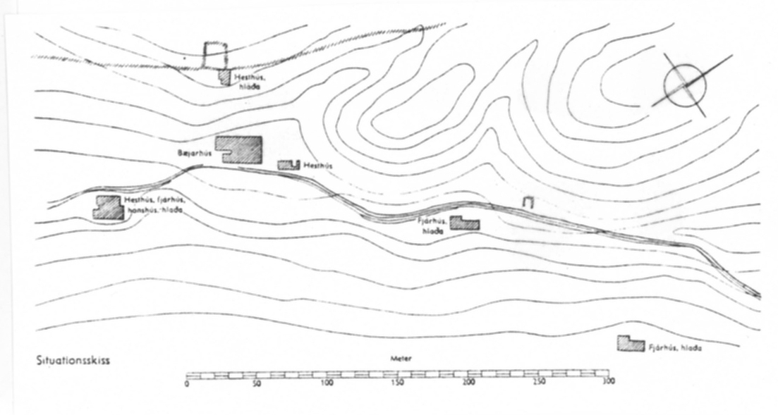 Modellen visar gården Mikligarður, som den såg ut 1939. Gården är belägen på norra Island i en dalgång. Den ligger på en grässlätt, som ger bete för husdjuren. Bebyggelsen på Island är spridd, då boskapsskötseln är huvudnäring inne i landet. Ibland är det flera kilometer mellan gårdarna. Gården (bær som också betyder by) består av en kärna av sammanbyggda hus (bæjarhus) samt enskilda hus, strödda över ett större område. Framför husklungan ligger det inhägnade tunet, där marken göds för grönsaks- och foderodling. Utanför tunet finns slåtterängarna.