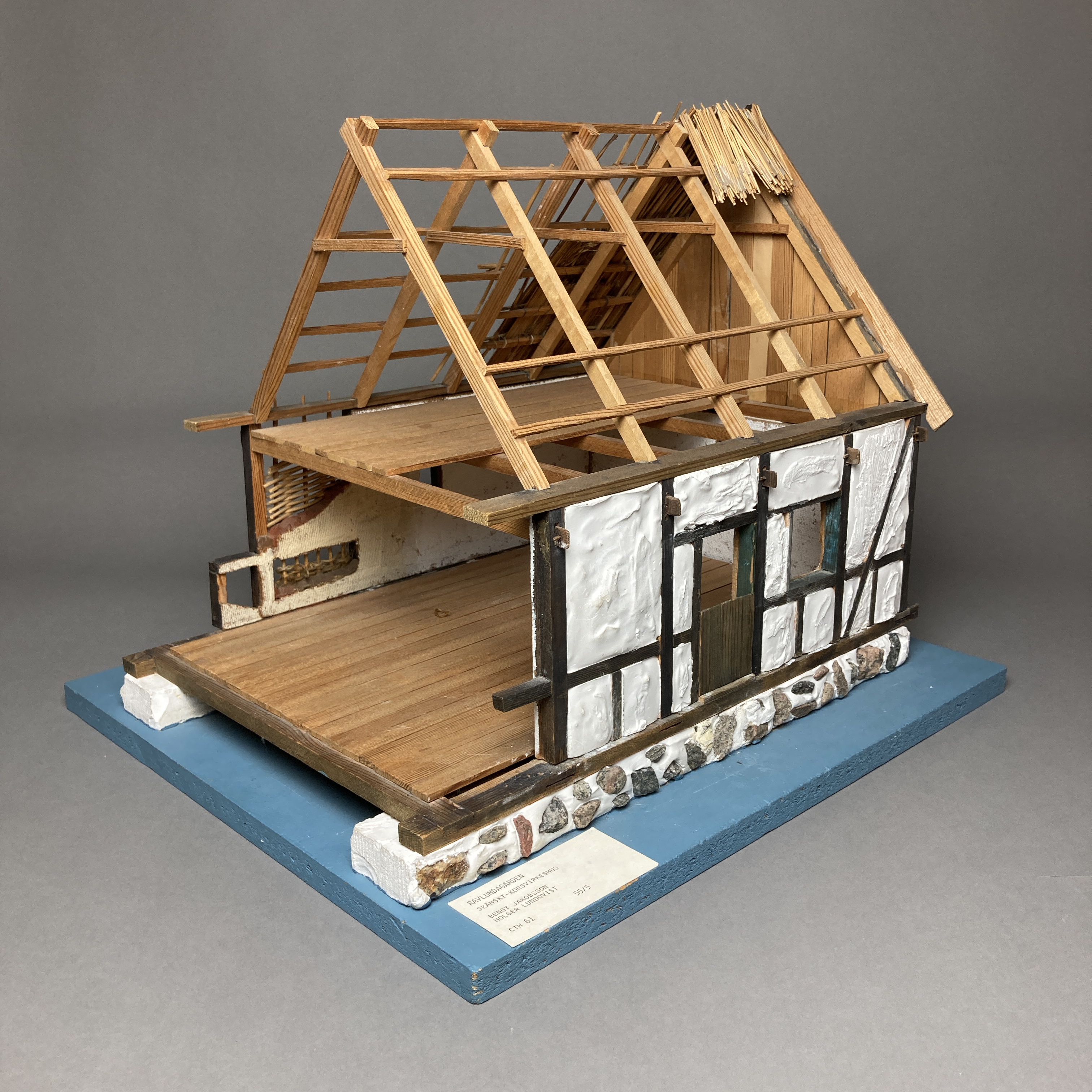 | dc.description.abstract | Modellen visar ett parti av manbyggnaden, som är uppförd i korsvirke. Väggarna har en stomme, timra, av ekträ och lerklinade fyllningar. Syllen ligger på en stenrad. På syllen står stolpar, som sammanbinds av ett väggband upptill. Mellan stolparna är tvärträ infällda som stöds av korta stolpar. I hörnen finns snedsträvor som förstärkning. Väggarna har två slags lerfyllnad. Leran som blandats med hackad halm, har från båda sidor klinats på vertikala stakar omlindade med halm, eller flätade vidjor. Klineväggar kräver mycket underhållsarbete med omklining och kalkning. Taket är halmtäckt av bindtakstyp. Se modell 87. | sv |