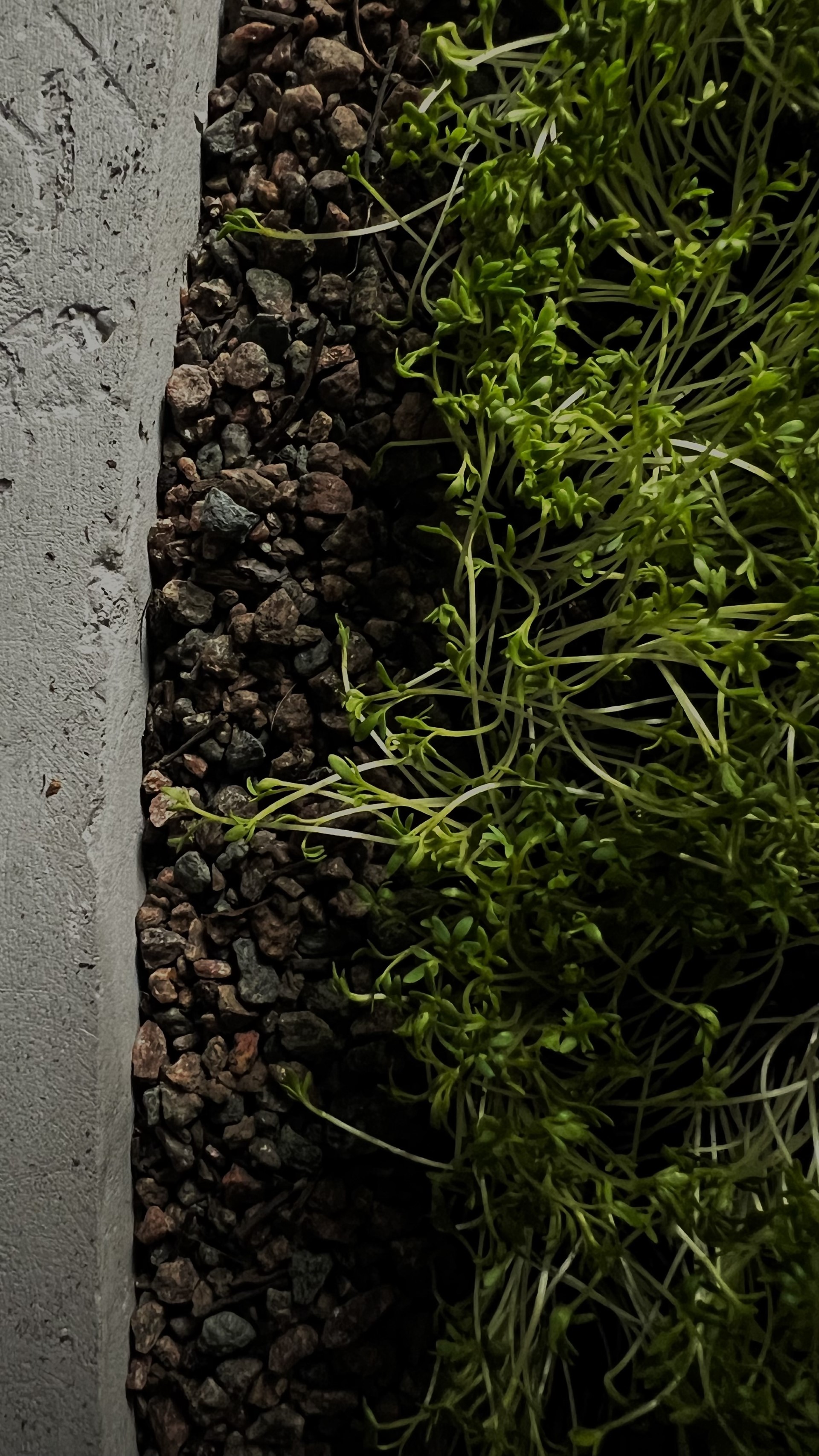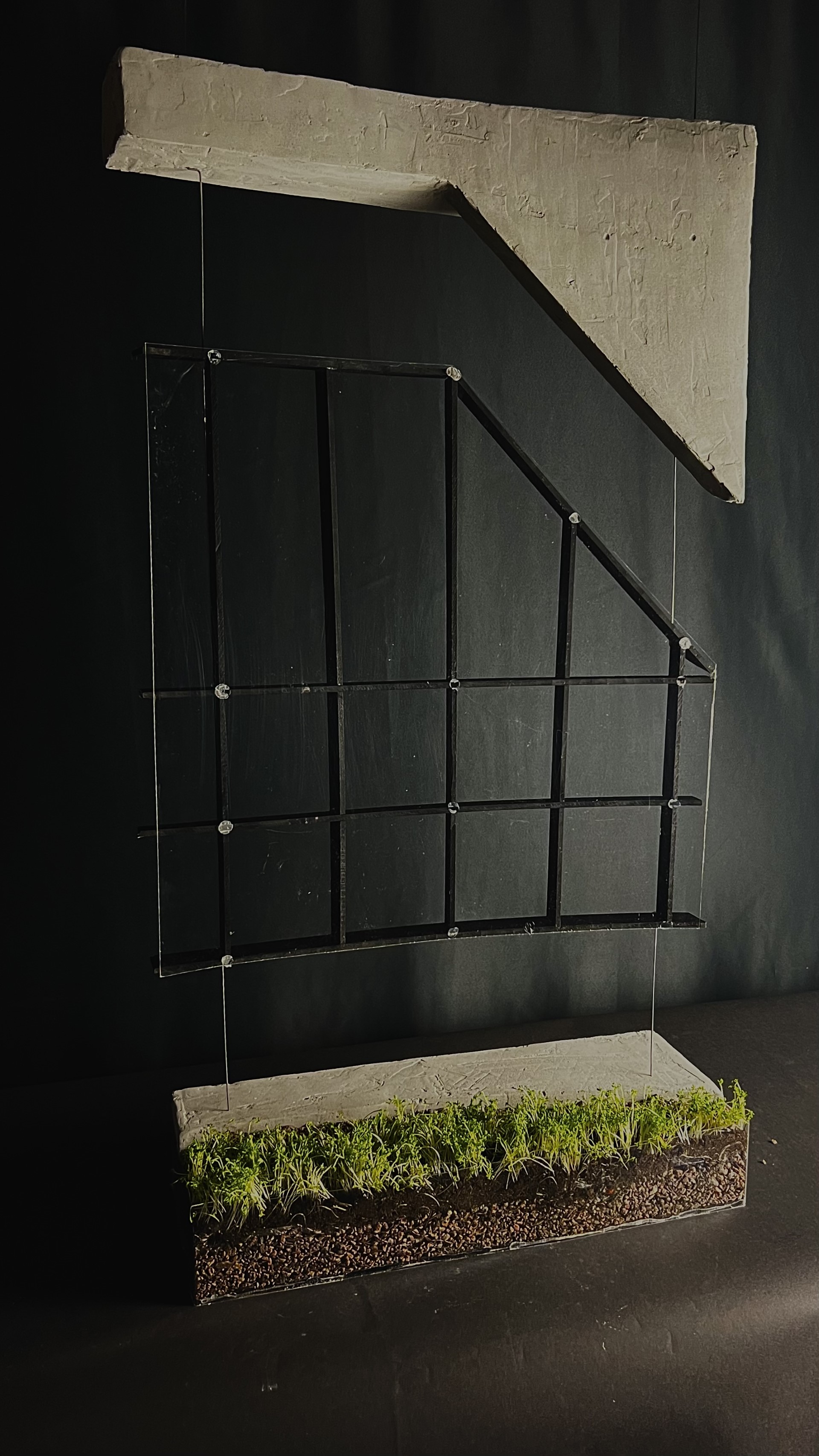 Spacklad cellplast, stålstänger, spraymålade plywood, MDF, akrylplast fäst med smältlim, grus, jord och krasse
