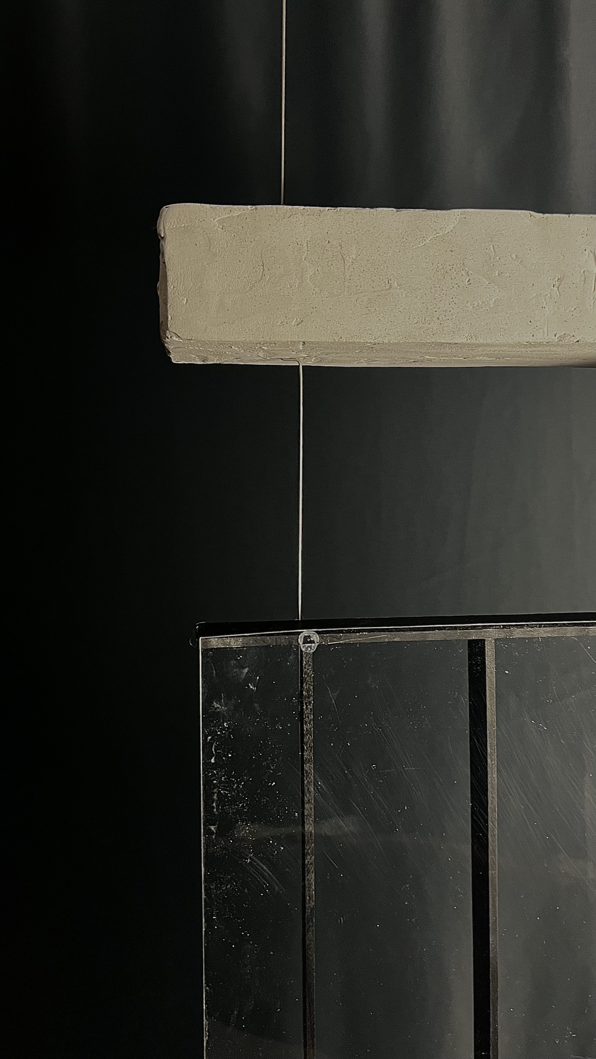 Modellen är i skala 1:10 och visar detalj på mötet mellan byggnadens olika material. Närmre bestämt ett fönster på tillbyggnadens nordöst- fasad. Bottenplattan och takkonstruktionen är konstruerad i svart betong med lavasten.