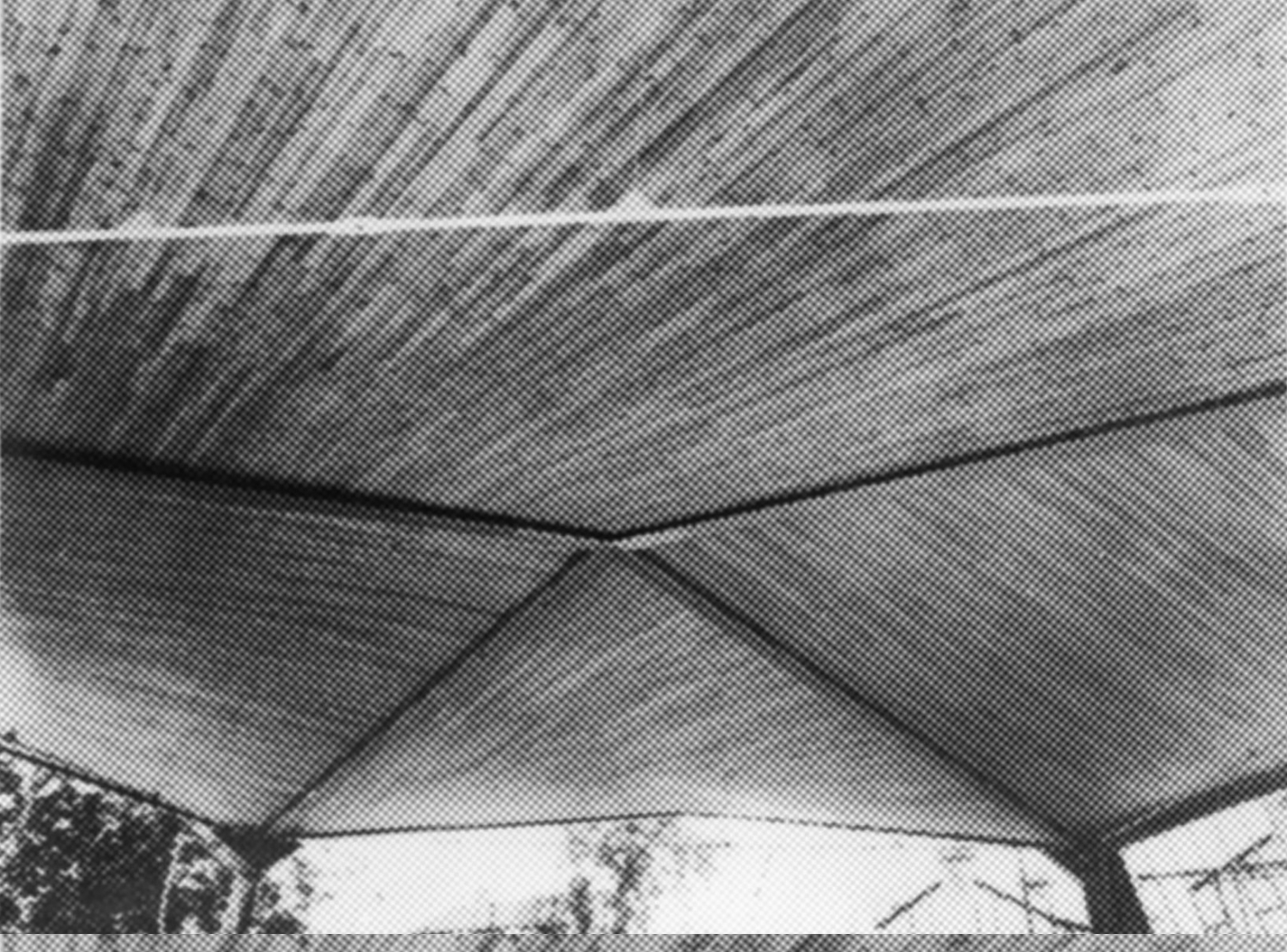 Modellen visar ett exempel på ett dubbelkrökt skal i trä. Taket är sammansatt av hyperboliska parabolider. Sådana ytor är böjda efter två parabelkurvor och kan också beskrivas som en rät linje löper utefter två linjer med olika riktning. Här har takdelarna just byggts av raka brädor som fästs invid varandra utefter två kantbjälkar. Se även modell 104.
