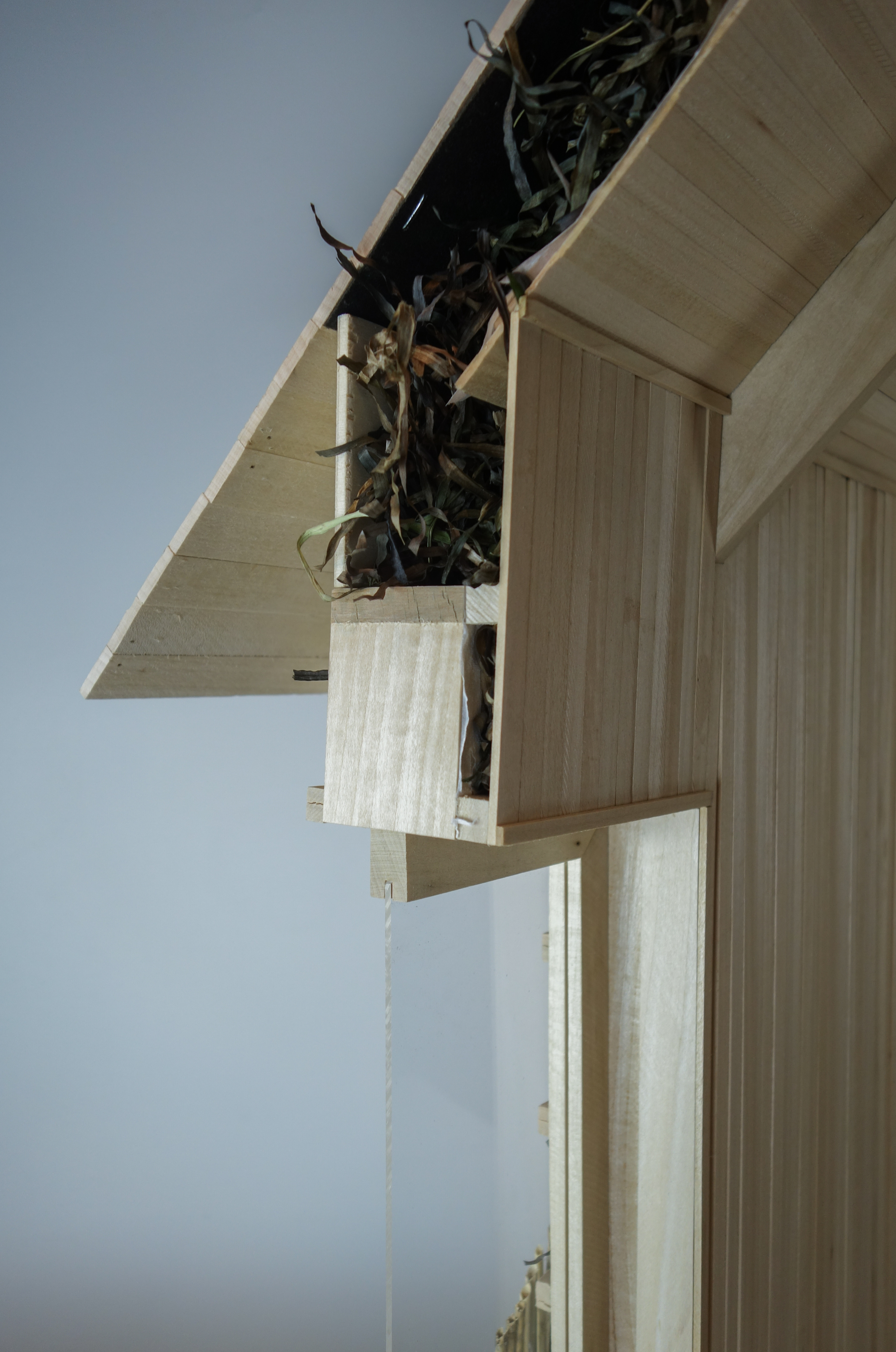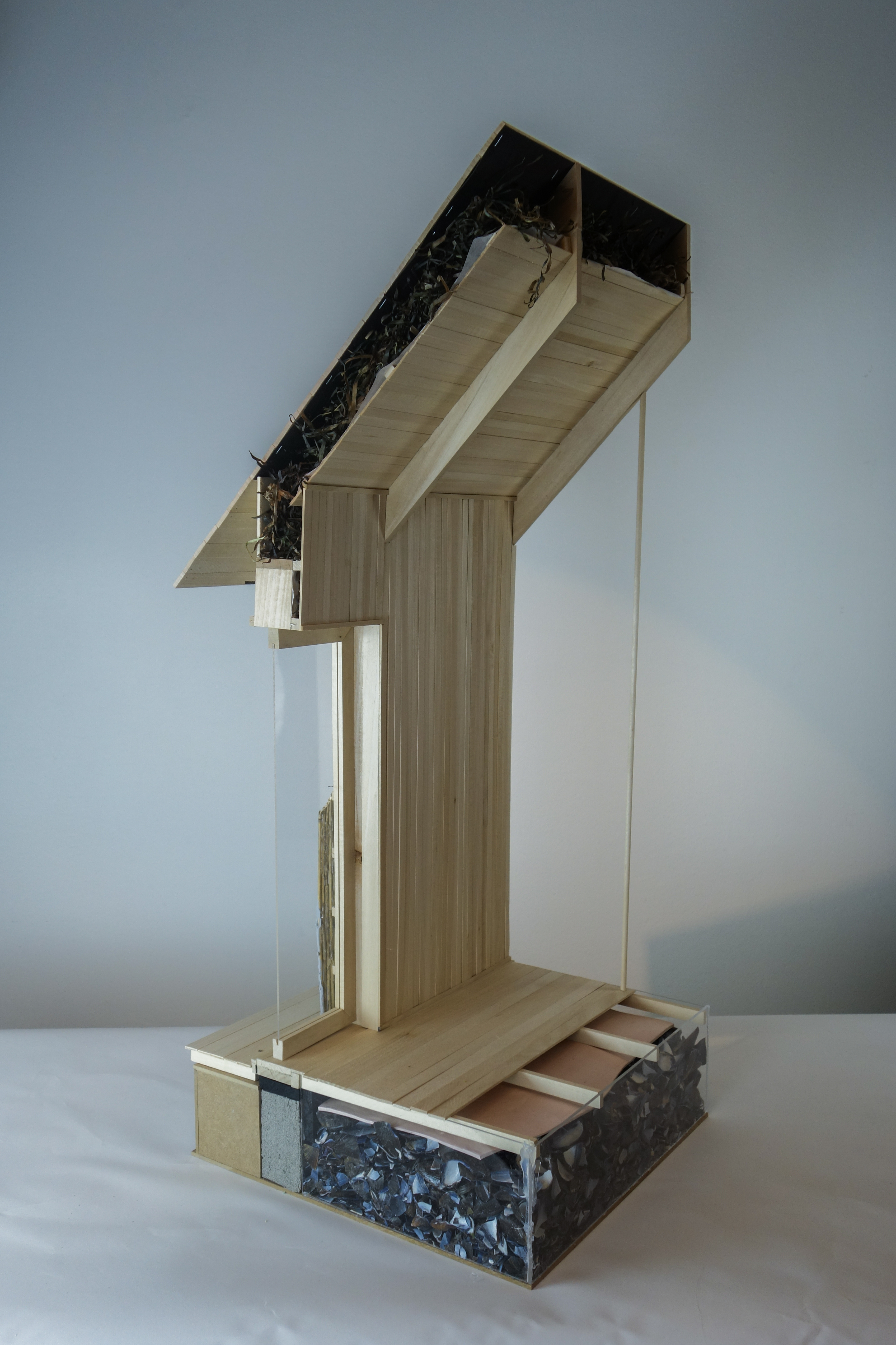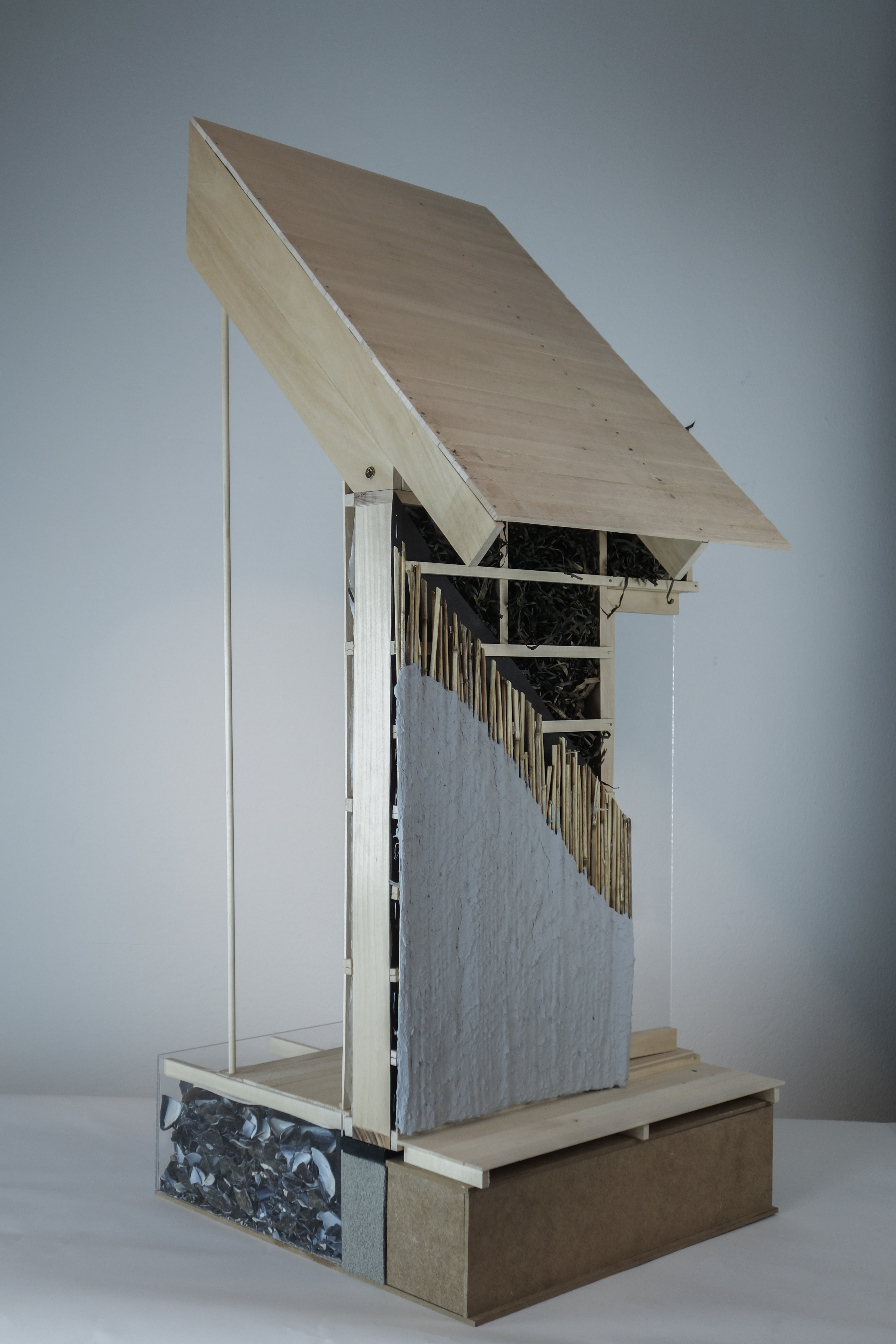 The master thesis researches how architecture relates to its production and extraction of natural resources to produce building materials, and explores how this could be done through a holistic and regenerative approach across different scales. In doing so, the thesis explores the theory of regenerative design, highlighting the need for eco-efficiency rather than eco-effectiveness where the circular idea of products as waste is eliminated, and instead seen as food for a renewable cycle. The research covers three filtering species such as blue mussels, eelgrass, and reeds and results in a mapping of their life cycle, biological function, occurrence, physical properties as well as their potential to perform as a building materials. The detail model shows in scale 1:5 three different applications of bio-based marine resources where the purpose is to highlight the possibilities of utilizing bio-based materials while showcasing what it means in terms of architectural expression and construction. The building stands on a foundation utilizing waste shells that is held together by a frame of granite stone. The walls and roof are insulated with eelgrass and the facade is cladded with a plastered reed mat. The model unfortunately lacks its traditionally inspired thatched reed roof.