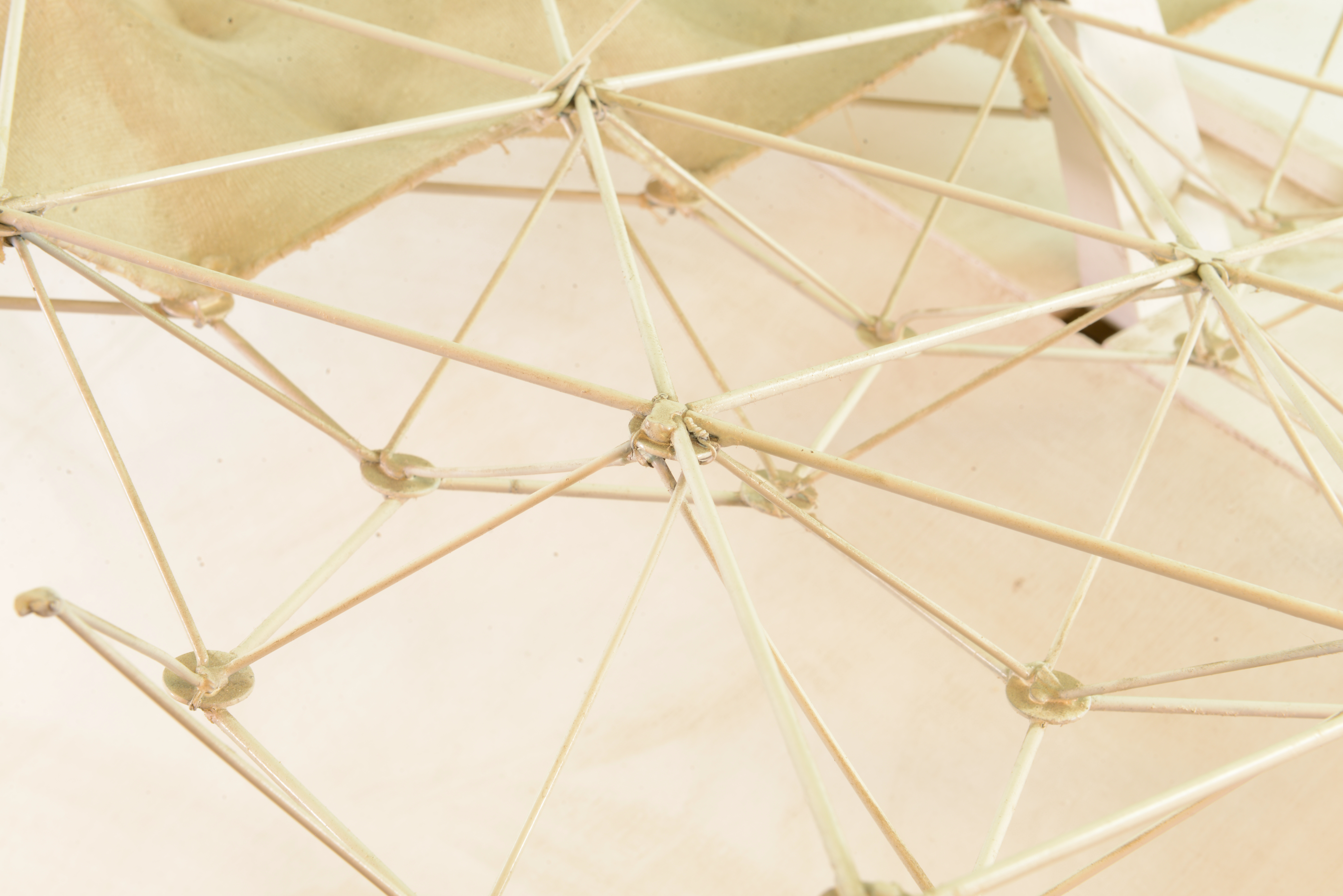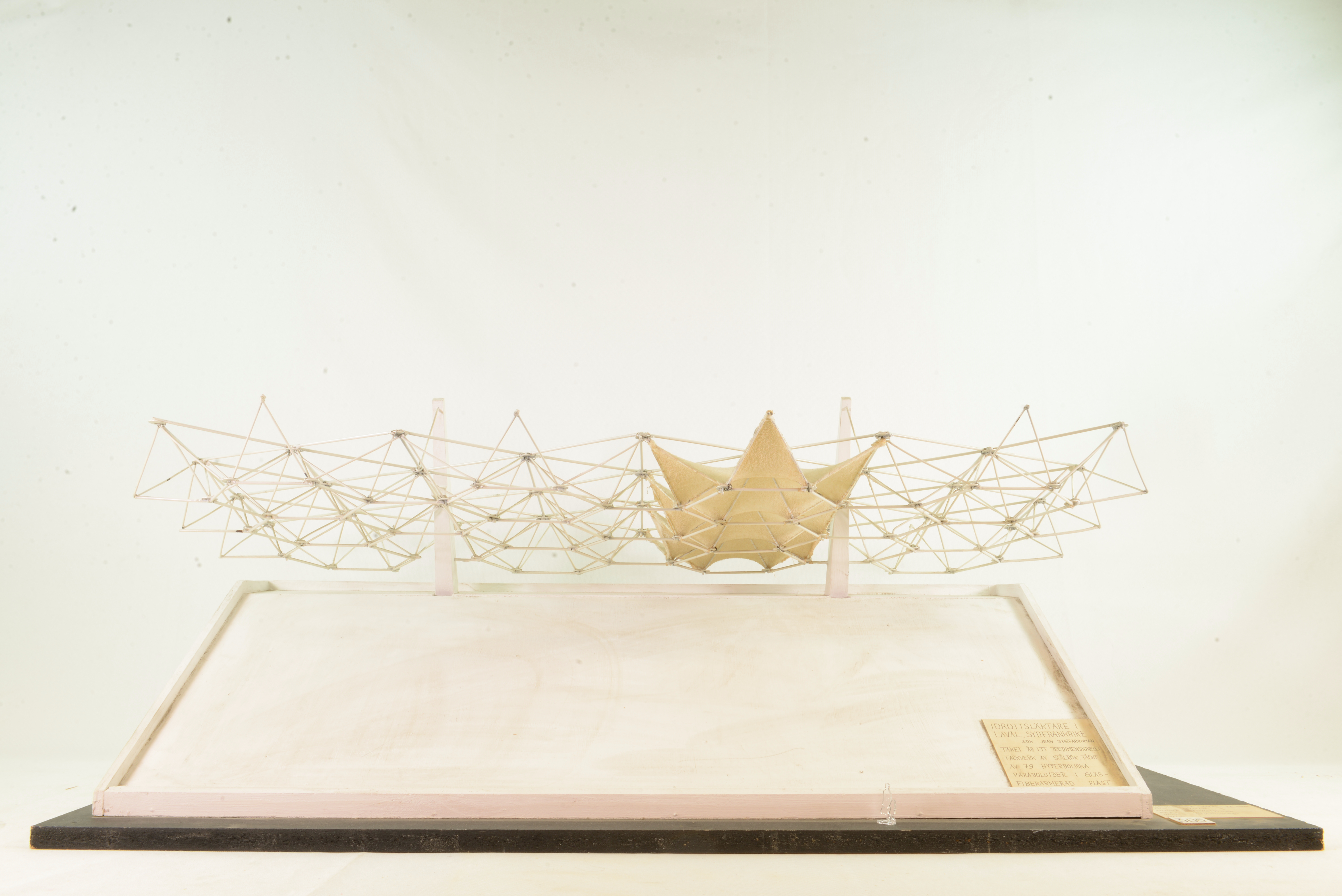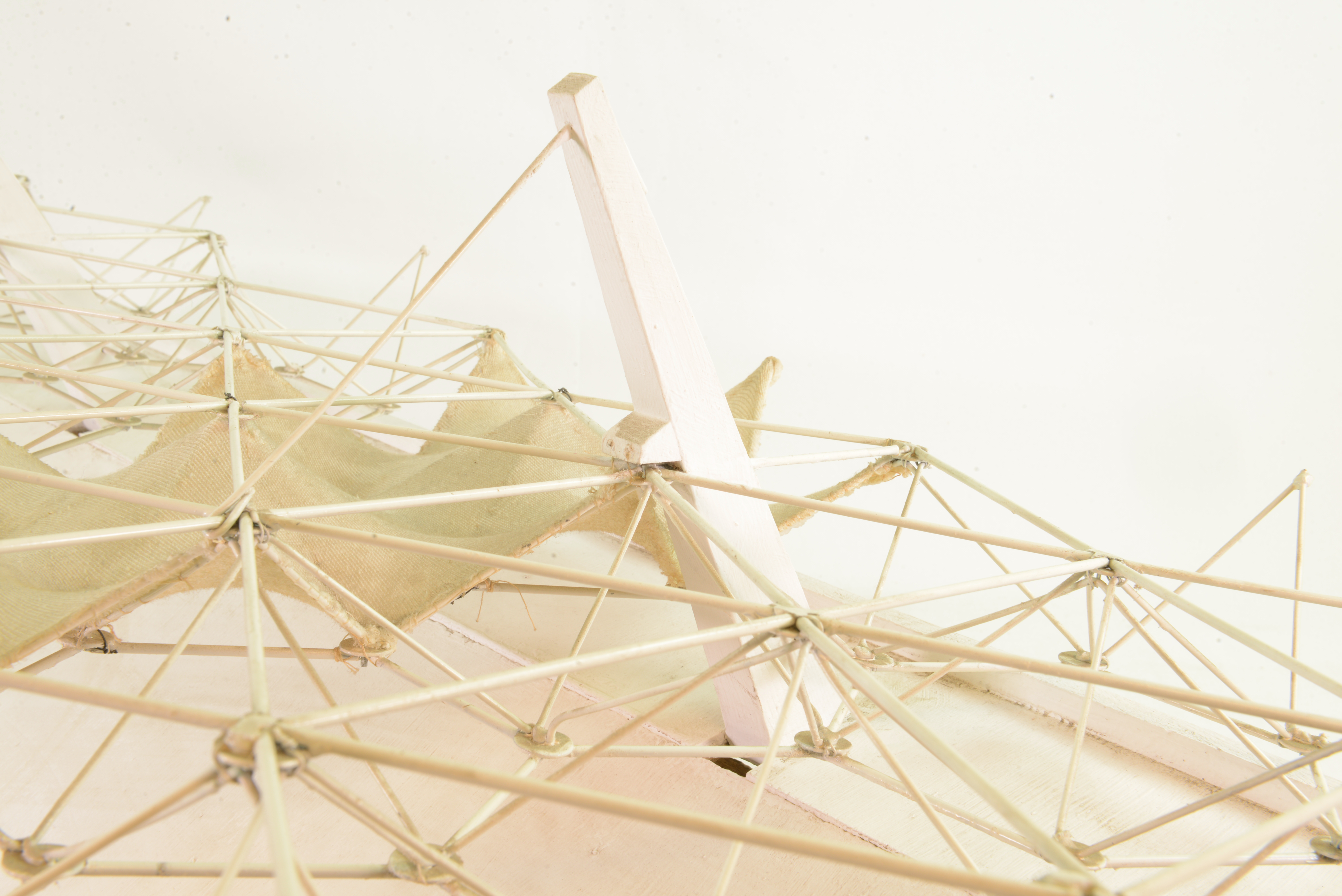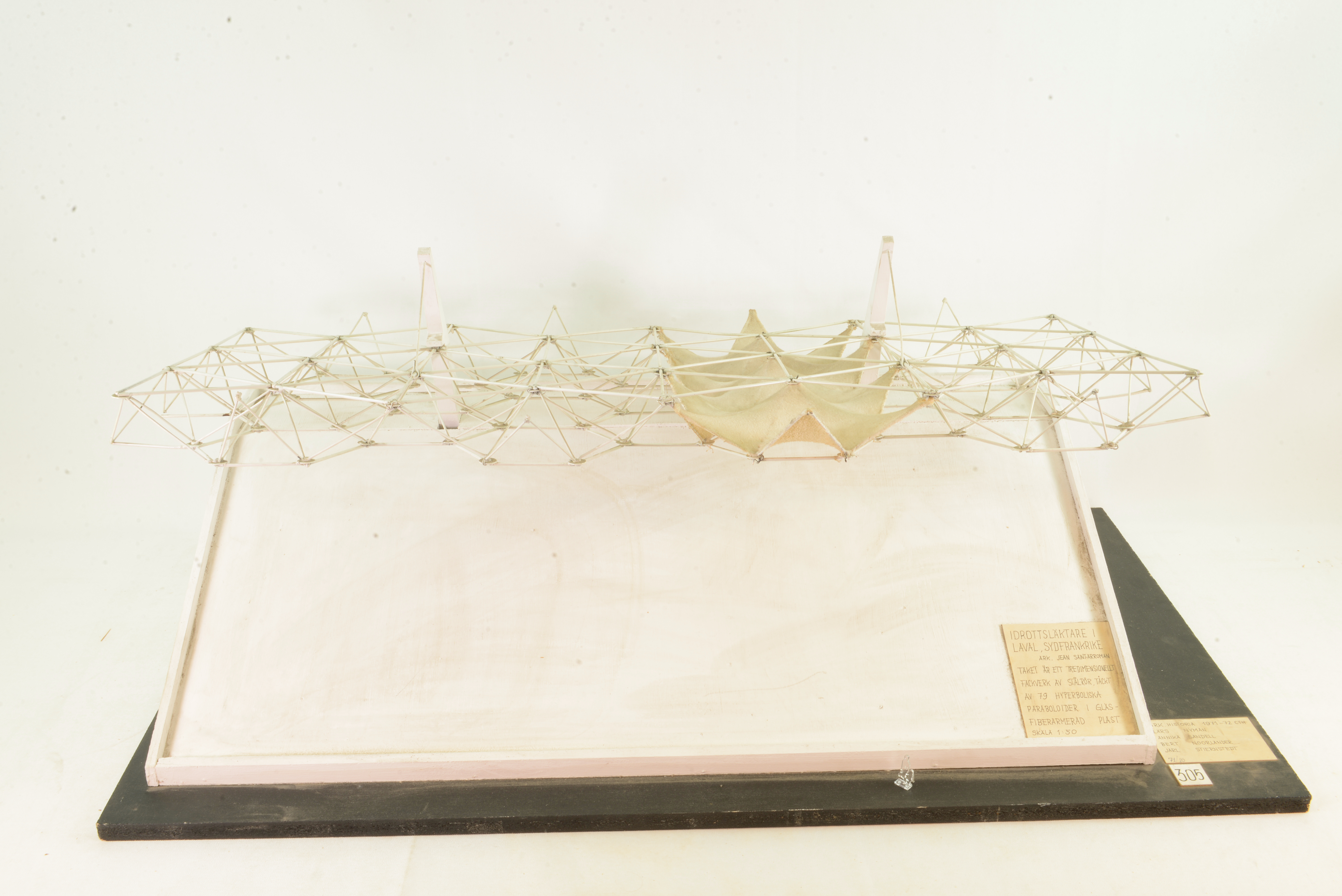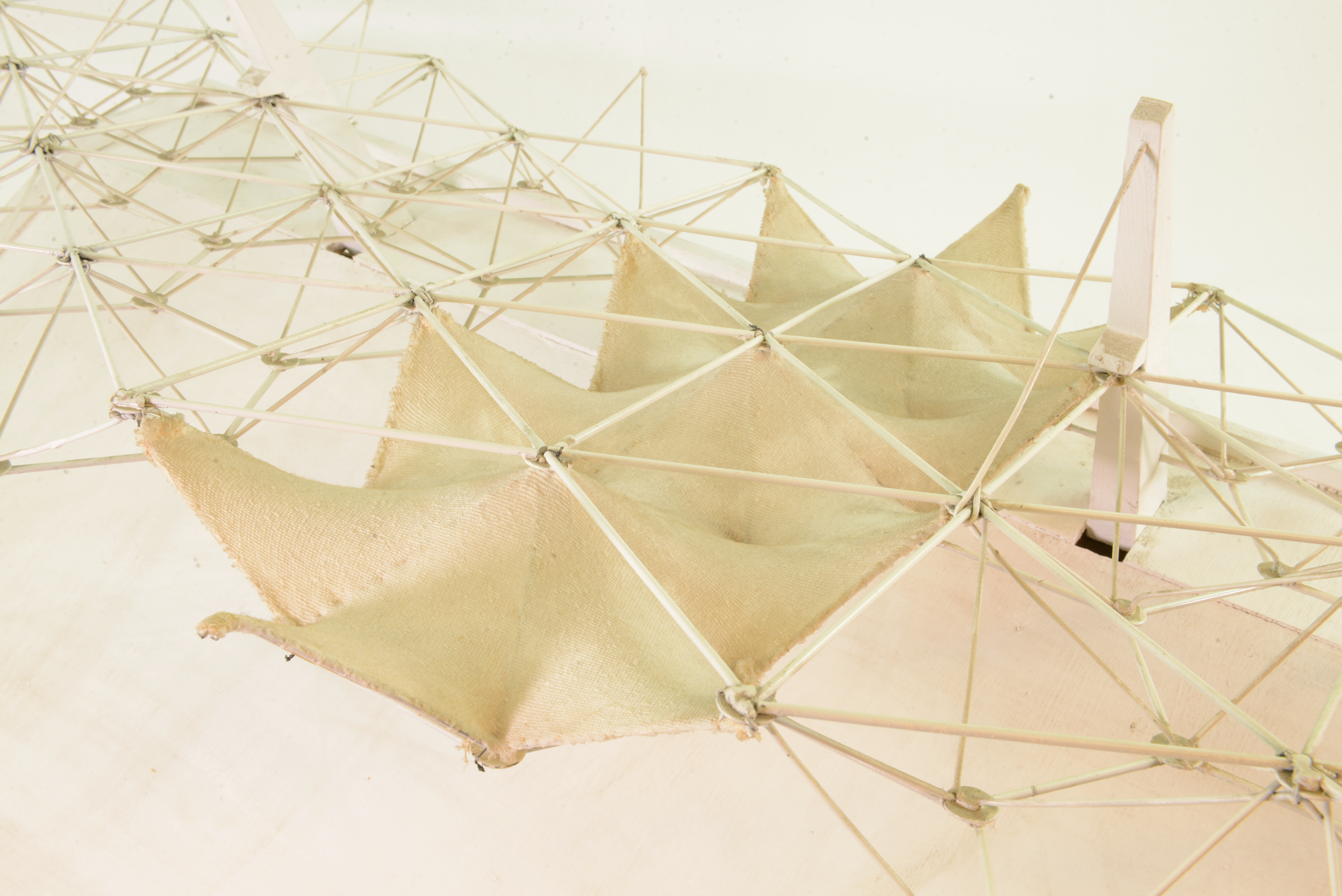 Läktartaket består av ett rymdfackverk av stålrör, som är täckt med 79 hyperboliska parabeloider i glasfiberarmerad plast.