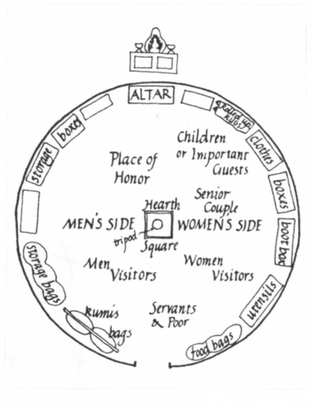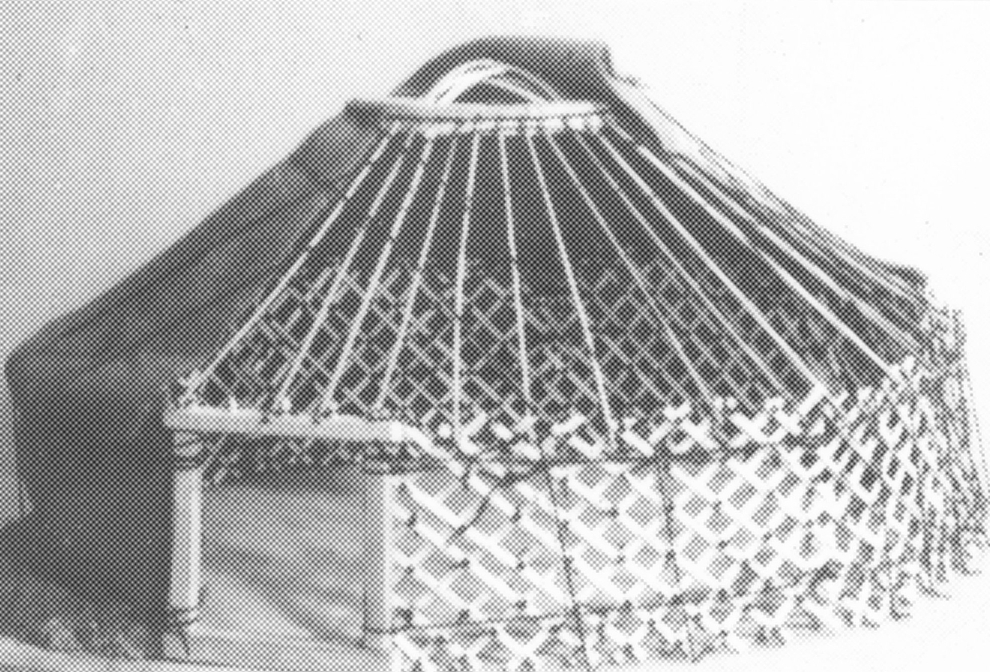 Modellen visar en jurt, det alltjämt vanliga, huslika och rymliga tält med tusenåriga anor, som används på den centralasiatiska stäppen från Kaspiska havet till sydöstra Sibirien. Jurtan skyddar väl mot hårda vindar och sträng vinterkyla. Tältets väggar består av flera sammansnörda spaljésektioner. De hopskjutbara spaljéerna görs av kluvna, svagt böjda videkäppar, som knyts samman med läderremmar. På väggen knyts takstängerna, som hålls samman i en takring mitt över rummet. Väggen hålls upptill in av ett spännband, som knyts fast i dörrkarmen. Över stommen läggs valkade färfiltar, under vintern i många lager, och de hålls på plats av rep. Dörren kan bestå av filtar, men görs oftast i trä. Jurtan har varit kvinnornas hemgift och rests av dem. Mongolerna ser i jurtan en bild av universum, där taket med sitt hål symboliserar himmel och sol medan eldstaden därunder är jorden med dess fem element; jord, trä (ramen), eld, metall och vatten (kitteln).