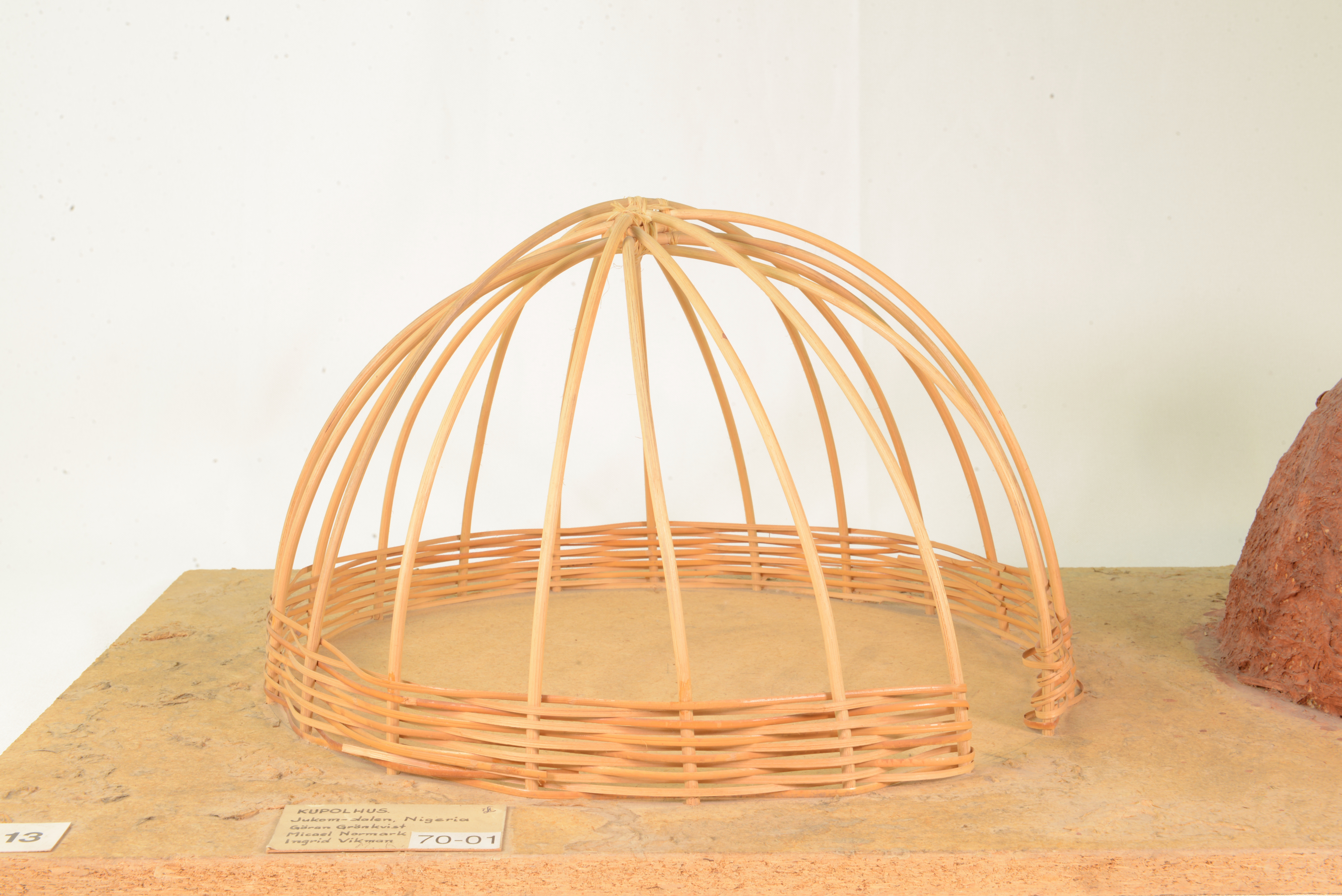 | dc.description.abstract | Modellen visar en hydda från Jukomdalen i Nigeria. En kupol formas av böjda käppar och vidjor, som flätas in mellan käpparna. Kupolen lerklinas och täcks med halm som skydd mot regn. | sv |