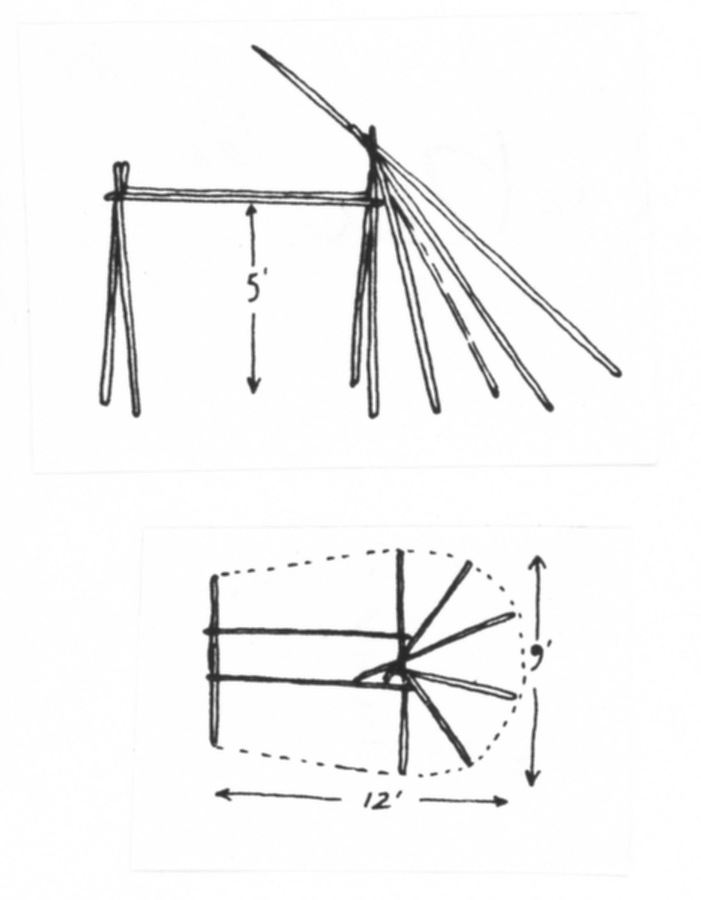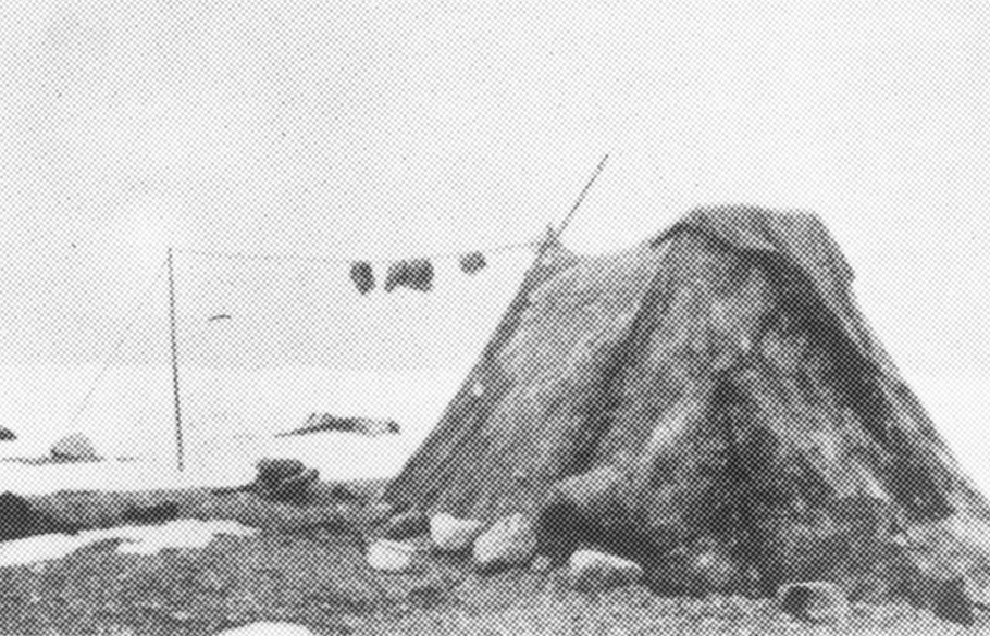 Modellen visar det speciella eskimåtältet med ryggås, som har använts i olika varianter i polarområdet. Stommen byggs av ett minimum av korta käppar och har vid brist på trä kunnat göras av djurben. Modellen visar centraleskimåernas variant. Den dubbla åsen bärs upp av två par stöttor. Mot de bakre stöttorna vilar flera käppar, så att det inre av tältet blir högre och vidare. Stommen täcks av hopsydda hudar av t ex säl. Vintertid kan flera tält kopplas samman.