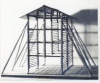 Modellen visar en storhässja för spannmål, bestående av spjälväggar i tre rader. Hässjan är sammanbyggd med logen, och golvet förlänger tröskvalsbanan.Den här typen av sammansatta hässjor med tak och golv har varit särskilt vanlig i södra Västerbotten.