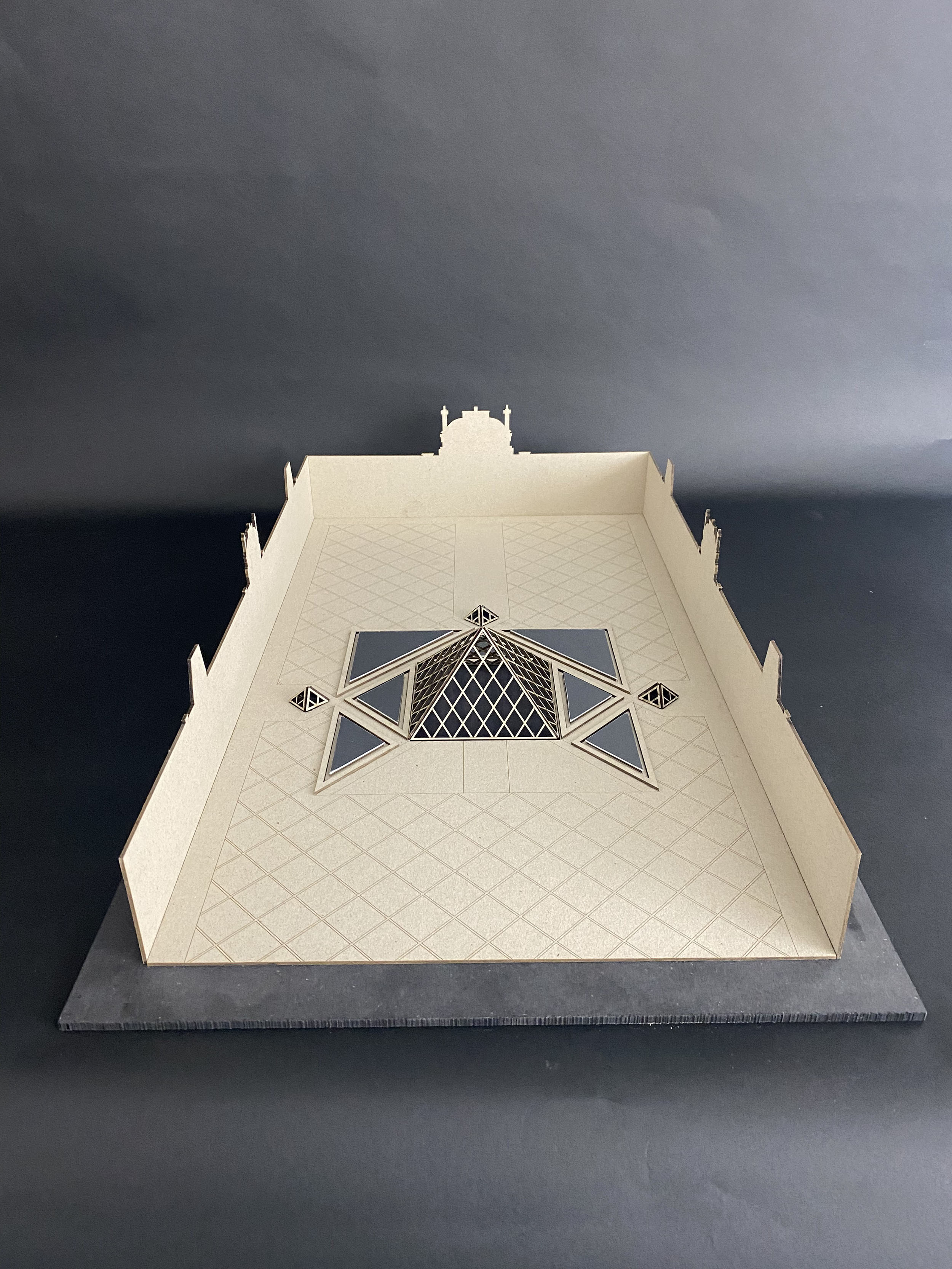 Modellen är en översiktsmodell över Louvren som visar den nya och gamla bebyggelsen med fokus på pyramiden. Modellen gestaltar rumsligheten mellan husen och hur det gamla möter det nya.