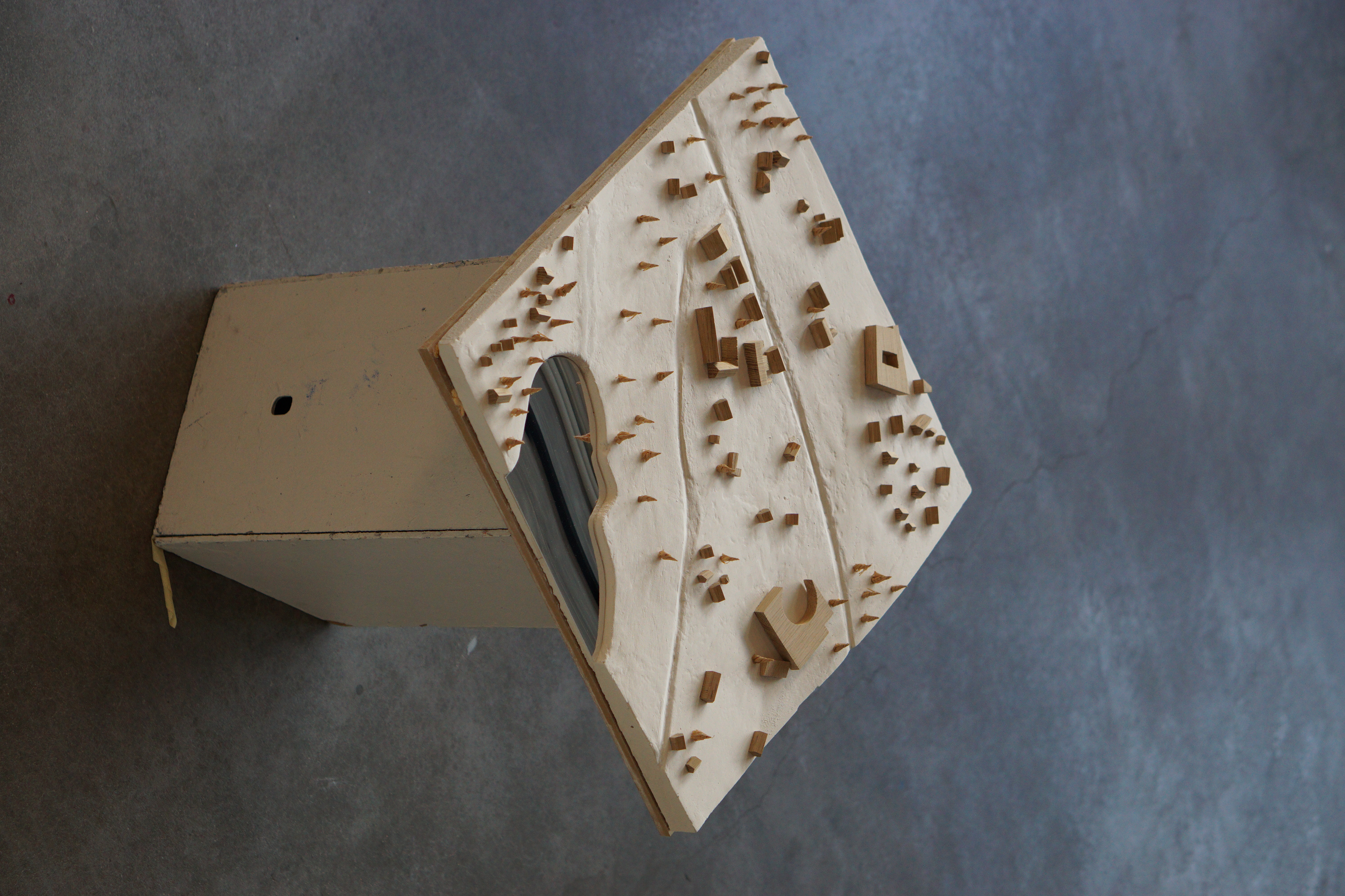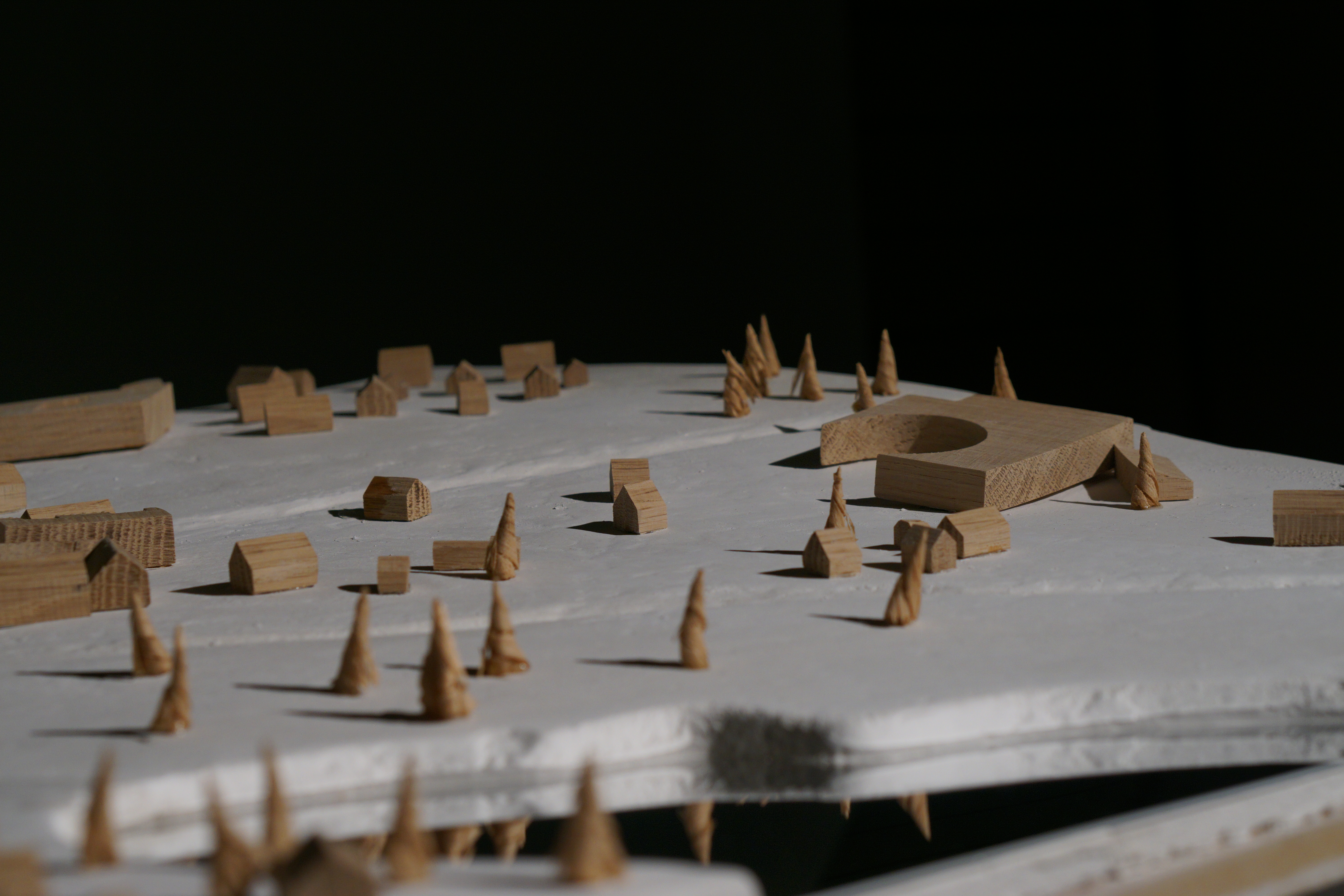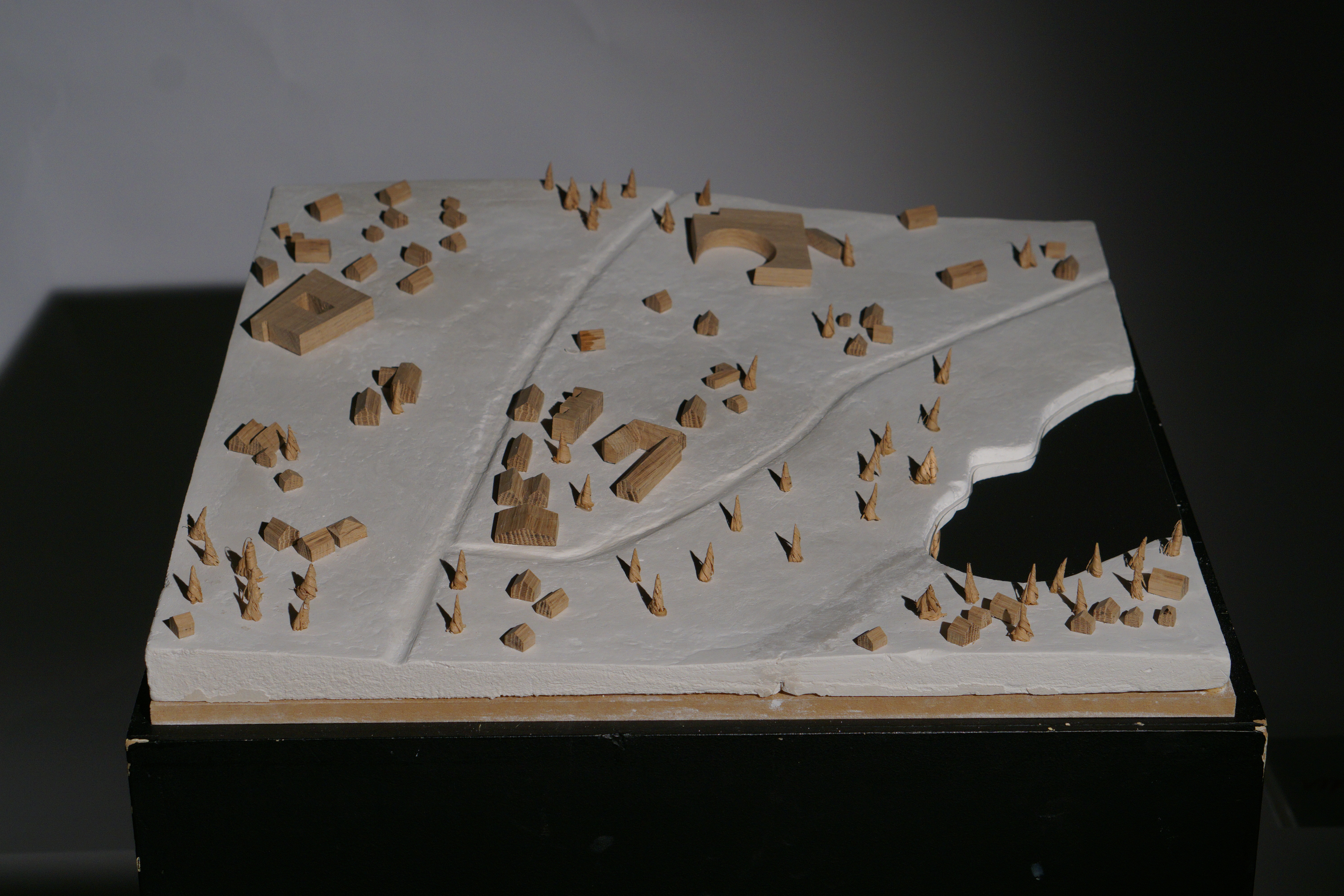 Cast gypsum for the landscape, oak for the surrounding buildings, reflective cardboard for the water, oak shavings for the trees