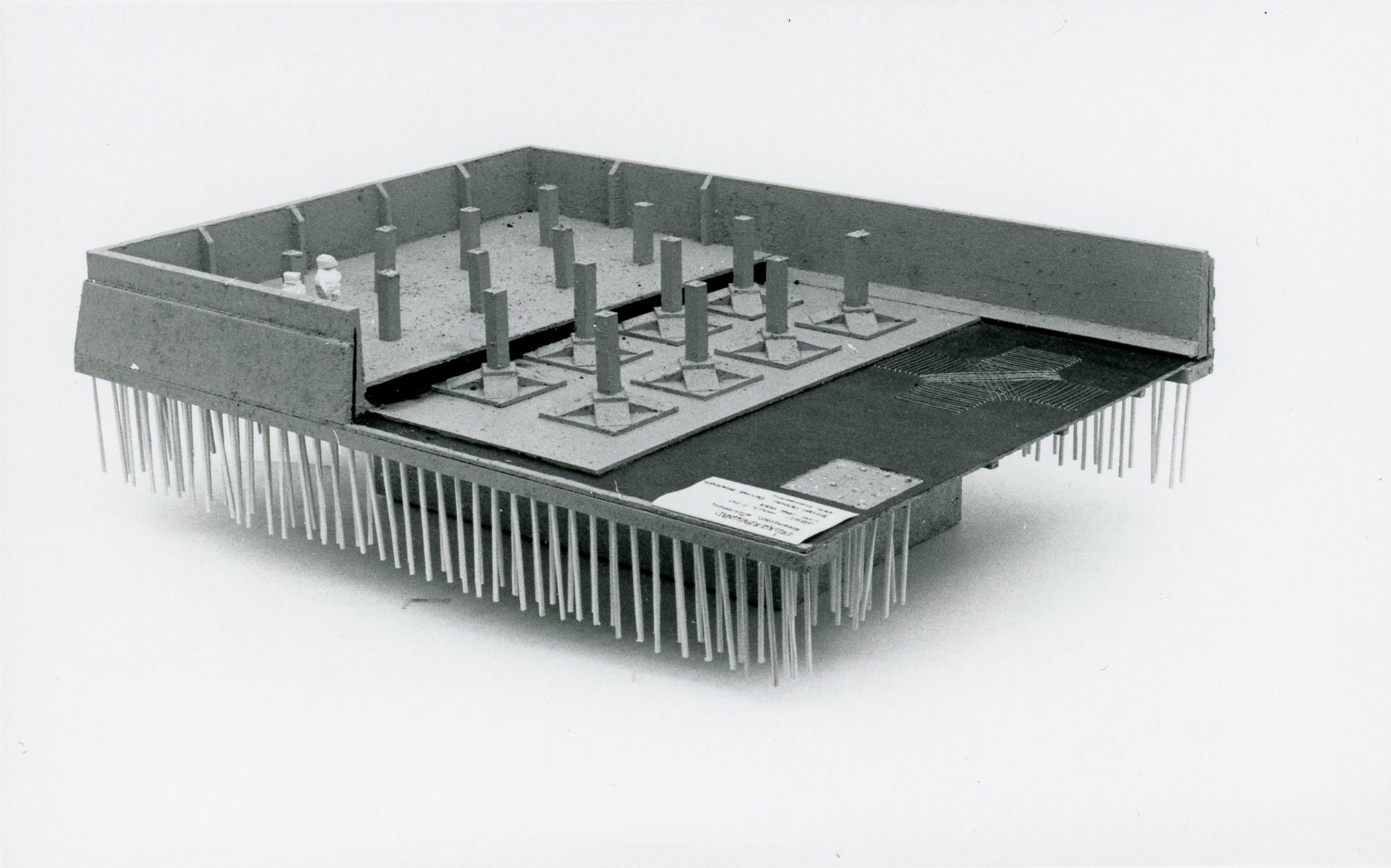 | dc.description.abstract | Modellen visar frilagerbyggnadens grundläggning. Modellen illustrerar både byggnadens gjutna grundläggningskar samt pålningen. För att hålla ute vattnet från källaren gjordes grunden tät med ett ingjutet isoleringsskikt. I ytterkanterna av grunden förstärktes grundplattan av gjutna sulor som gjöts fast ovan pålningen. Utrymmet mellan grundplattan och övergolvet, även detta av betong, fylldes med koks. | sv |