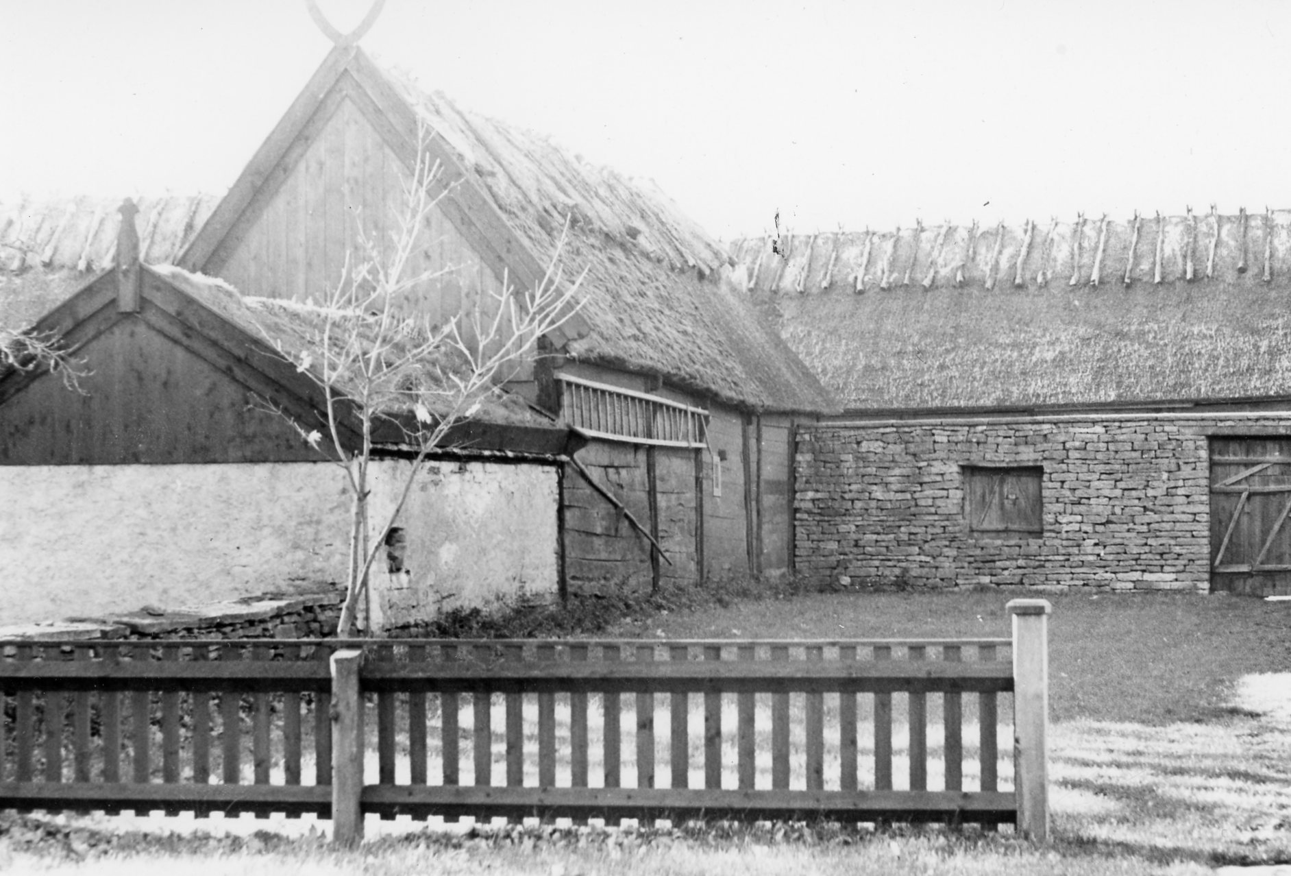 Modellen visar gårdens stall, som är byggt delvis i skiftesverk, delvis av kallmurad kalksten.