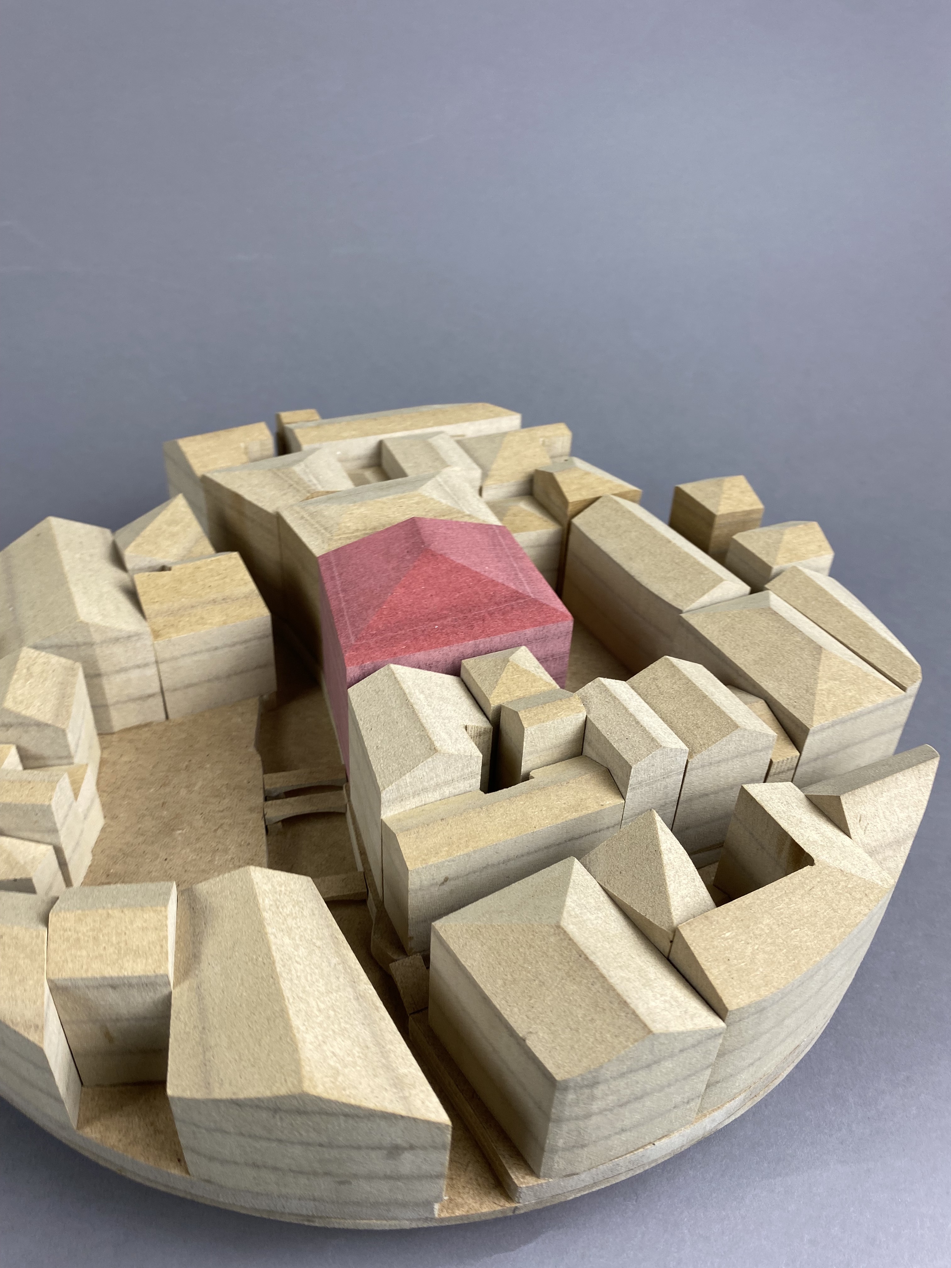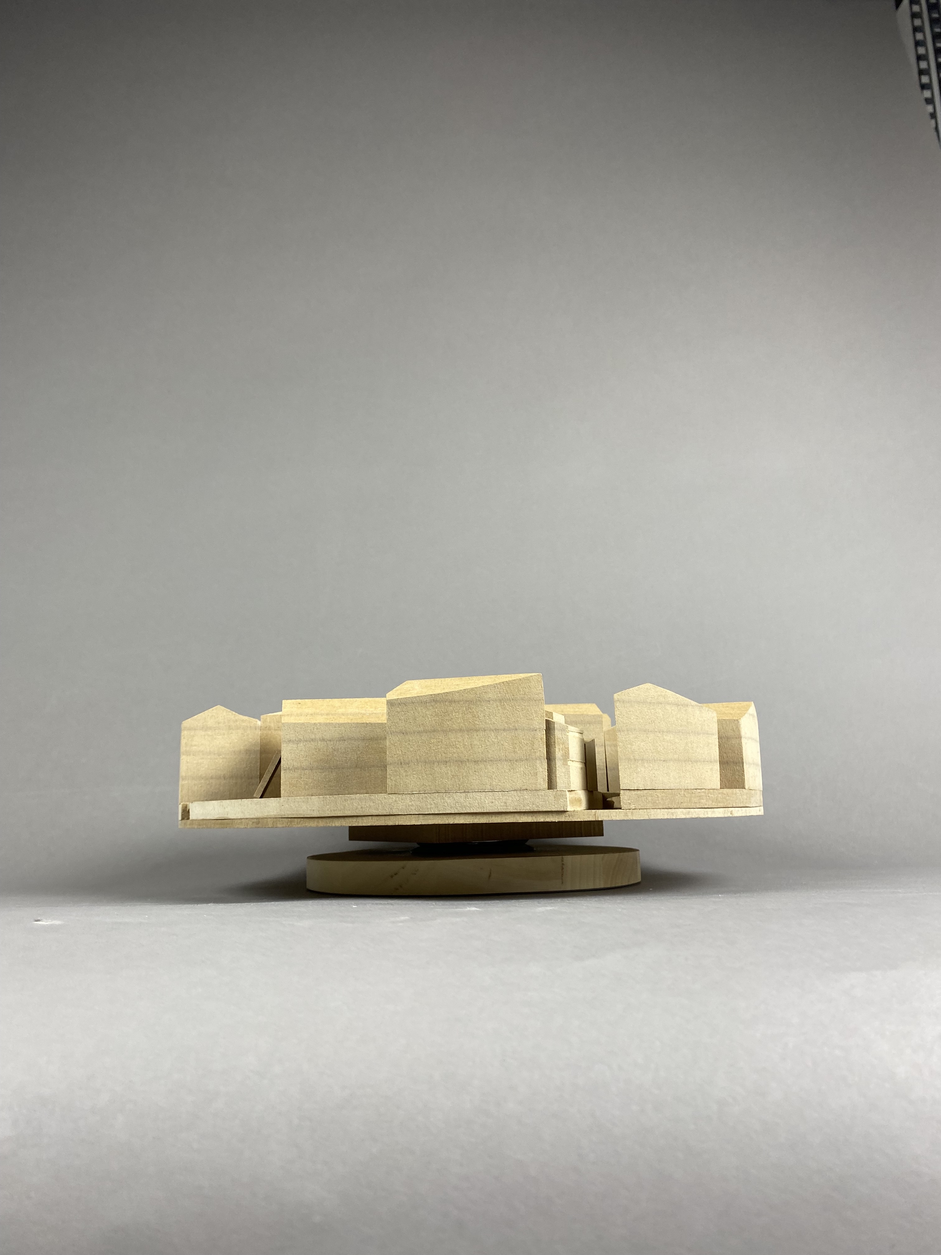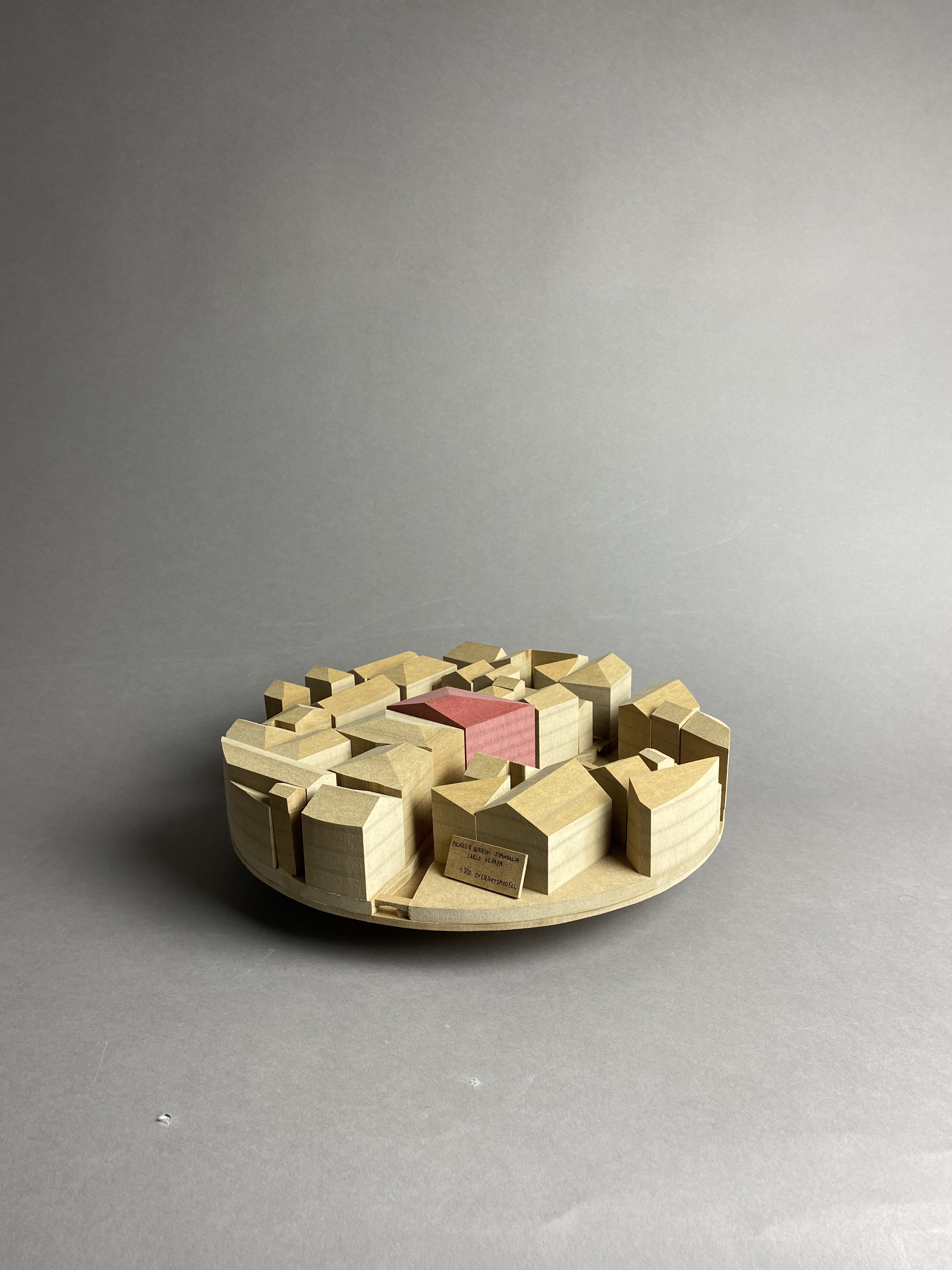 Carlo Scarpa is the architect behind the modern renovation of the garden and part of the ground floor for the Venetian institution Querini Stampalia. Scarpa is admired for his balanced combination of old and new elements, as well as on a great workmanship of the materials. The model represents the context of the building. It shows the relation to Venice's canals, squares, streets and surrounding houses. By placing the model on a twirling plate, the spectator is able to easily see into all narrow alleys between the buildings. The massive buildings are significant to the experience of the location, hence, mdf was a suitable material to illustrate in. The brown 12mm-thick discs symbolize floors on a scale of 1:300.