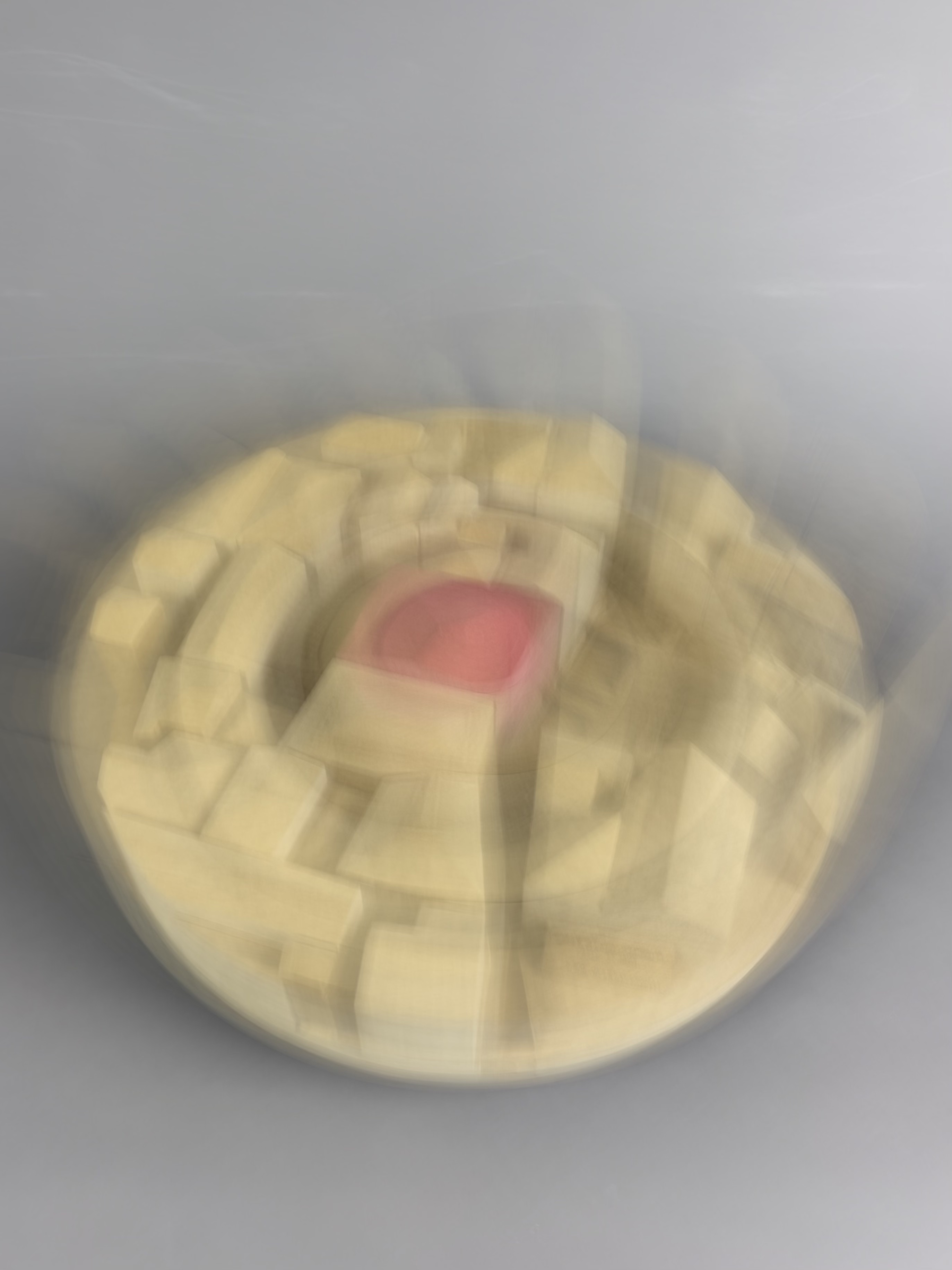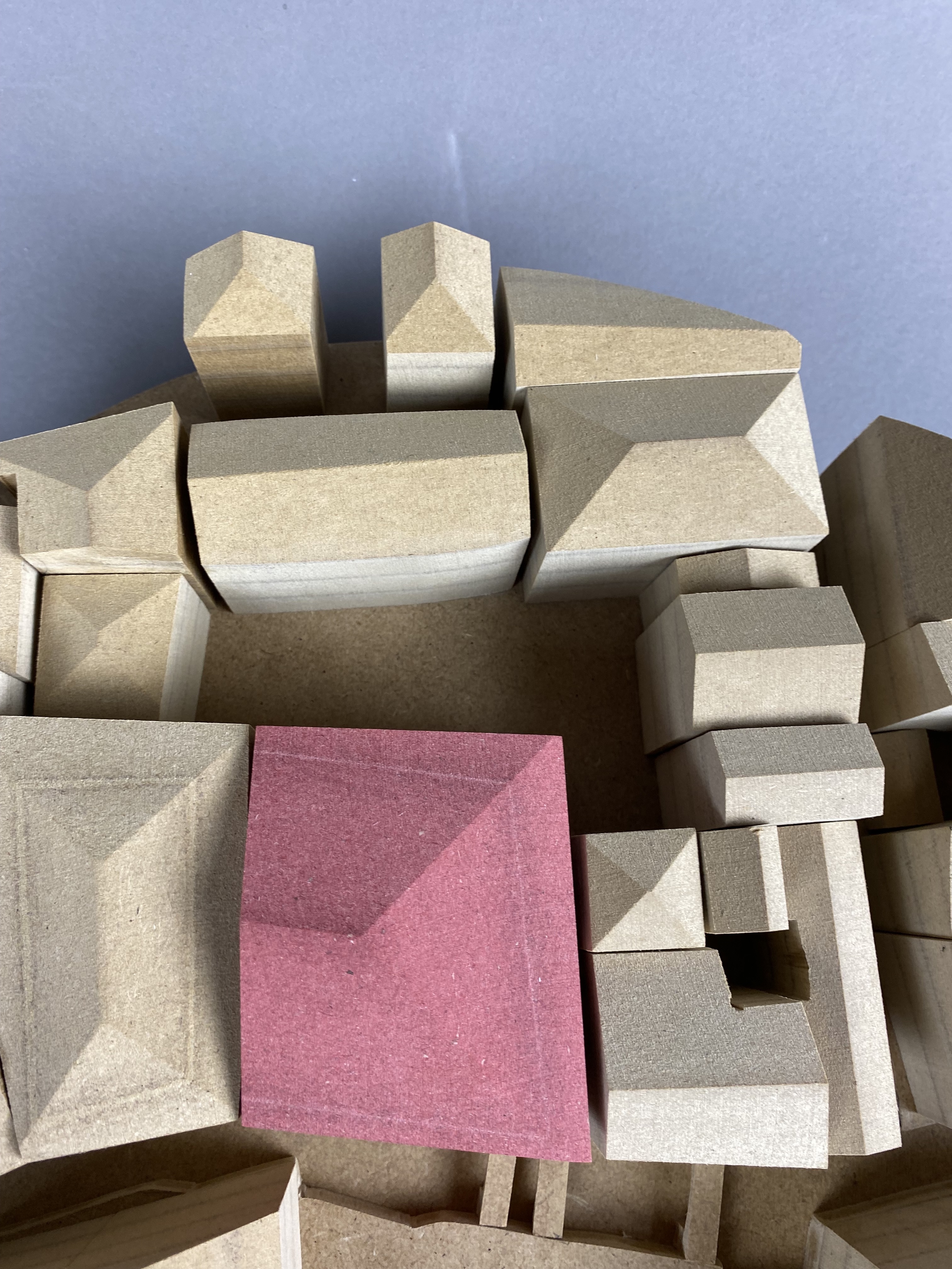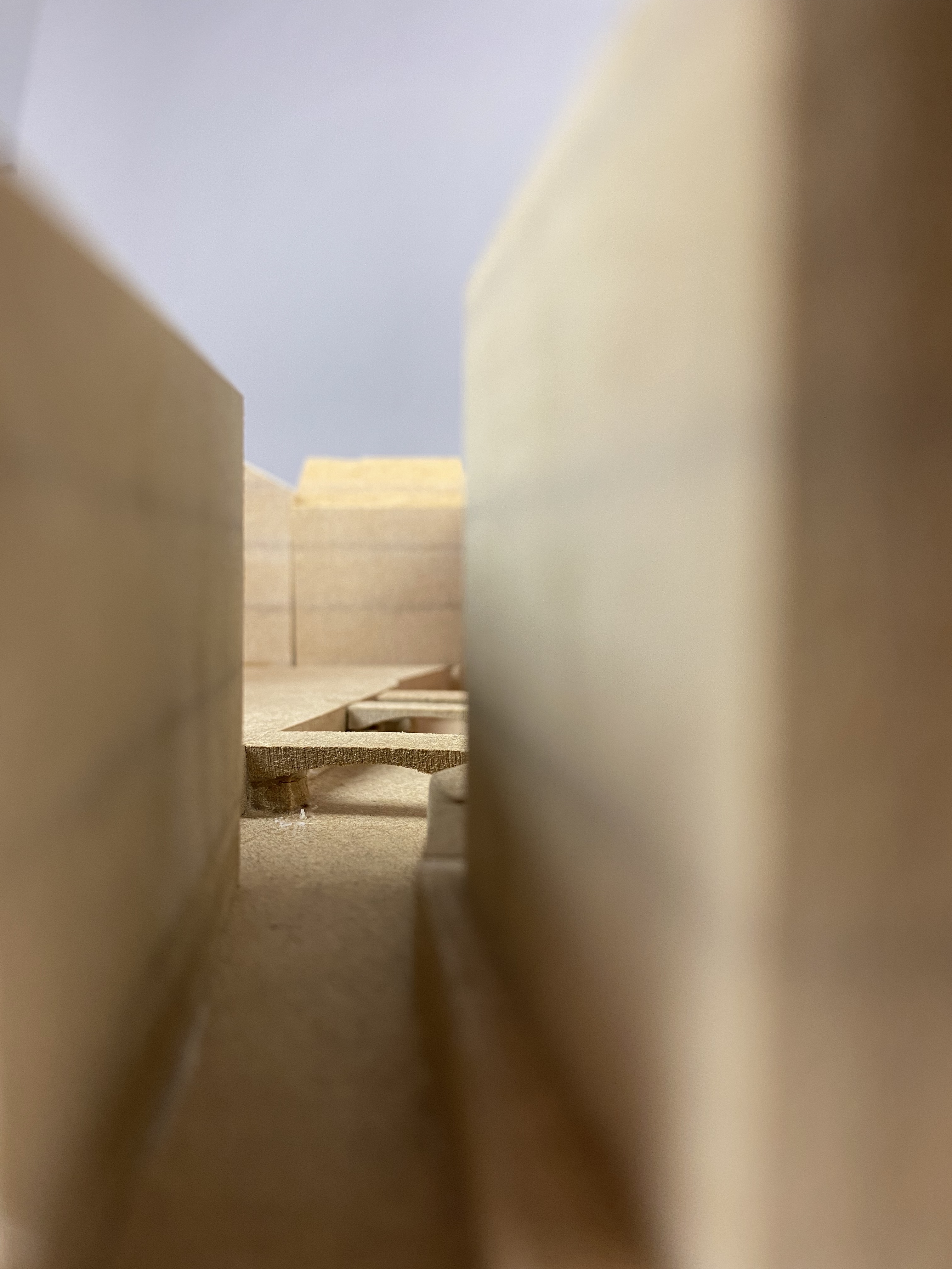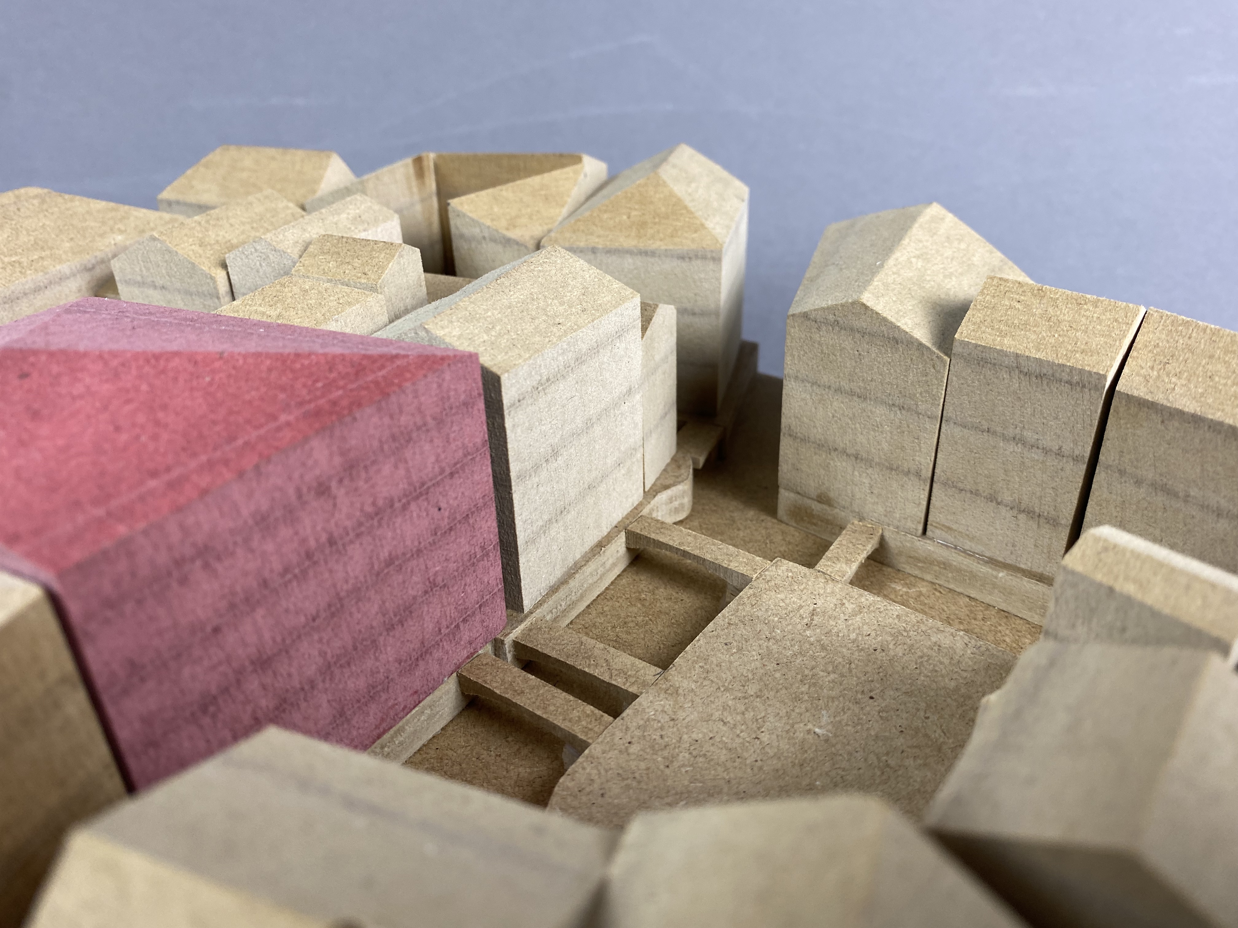 Carlo Scarpa is the architect behind the modern renovation of the garden and part of the ground floor for the Venetian institution Querini Stampalia. Scarpa is admired for his balanced combination of old and new elements, as well as on a great workmanship of the materials. The model represents the context of the building. It shows the relation to Venice's canals, squares, streets and surrounding houses. By placing the model on a twirling plate, the spectator is able to easily see into all narrow alleys between the buildings. The massive buildings are significant to the experience of the location, hence, mdf was a suitable material to illustrate in. The brown 12mm-thick discs symbolize floors on a scale of 1:300.