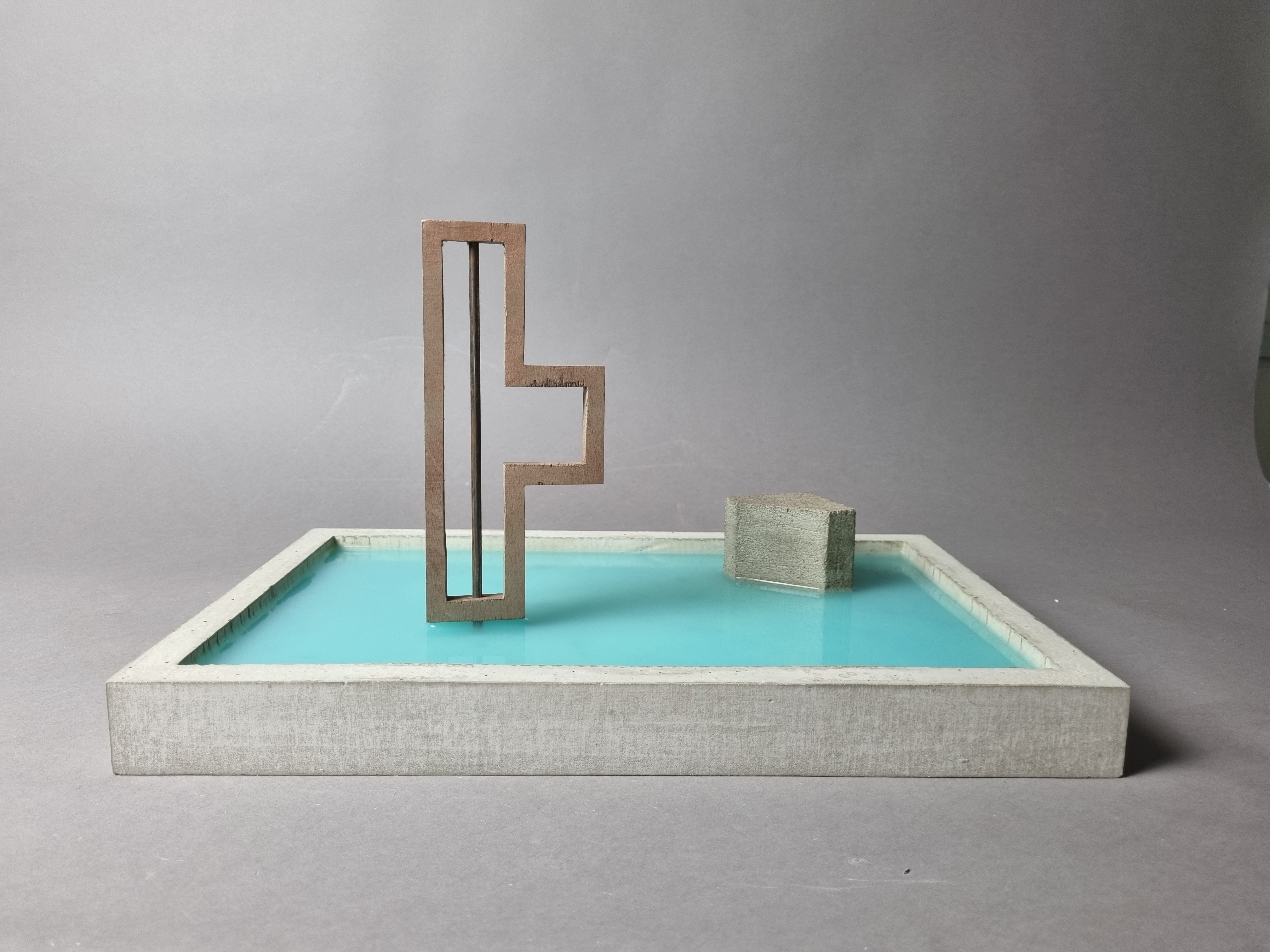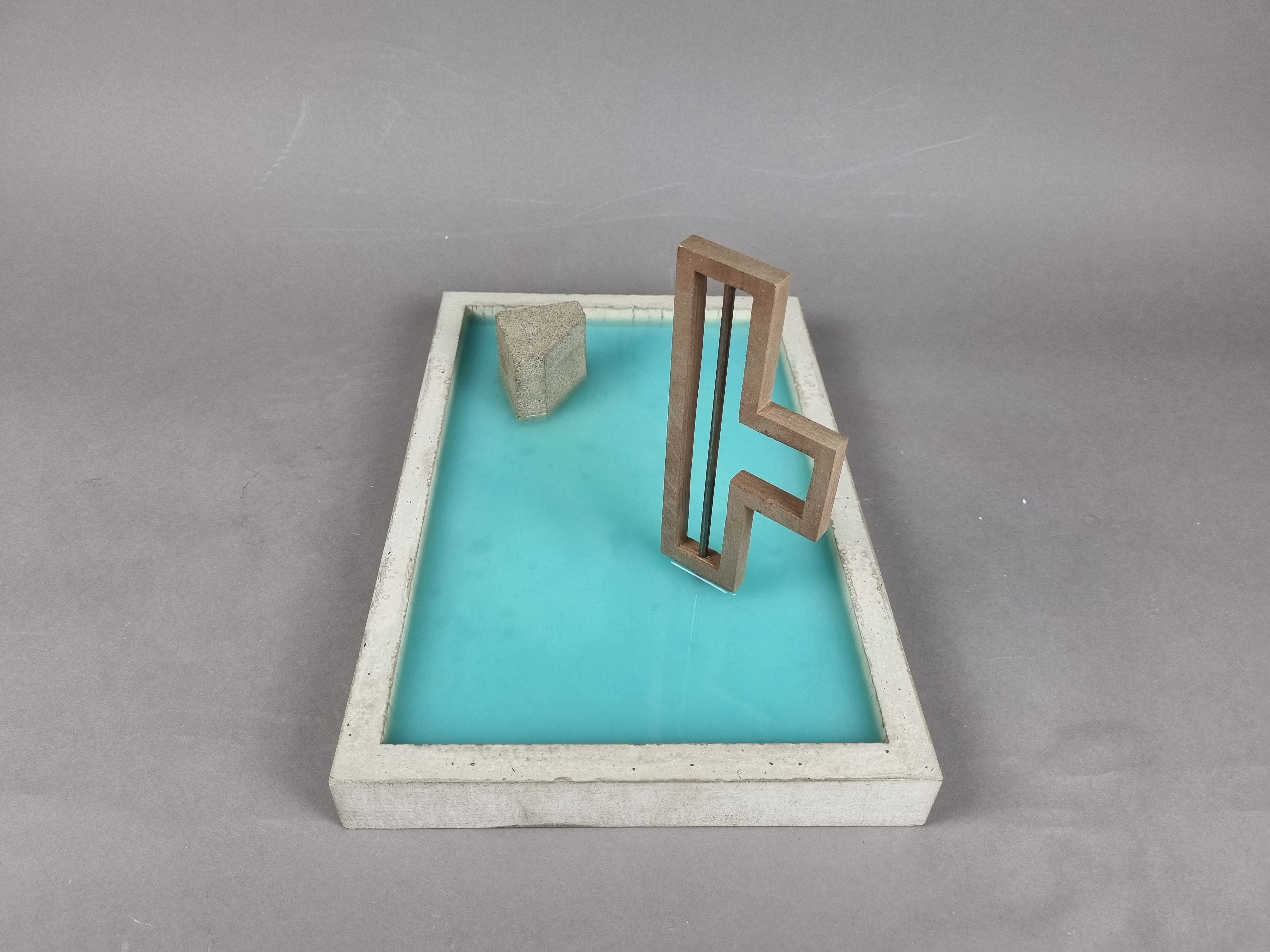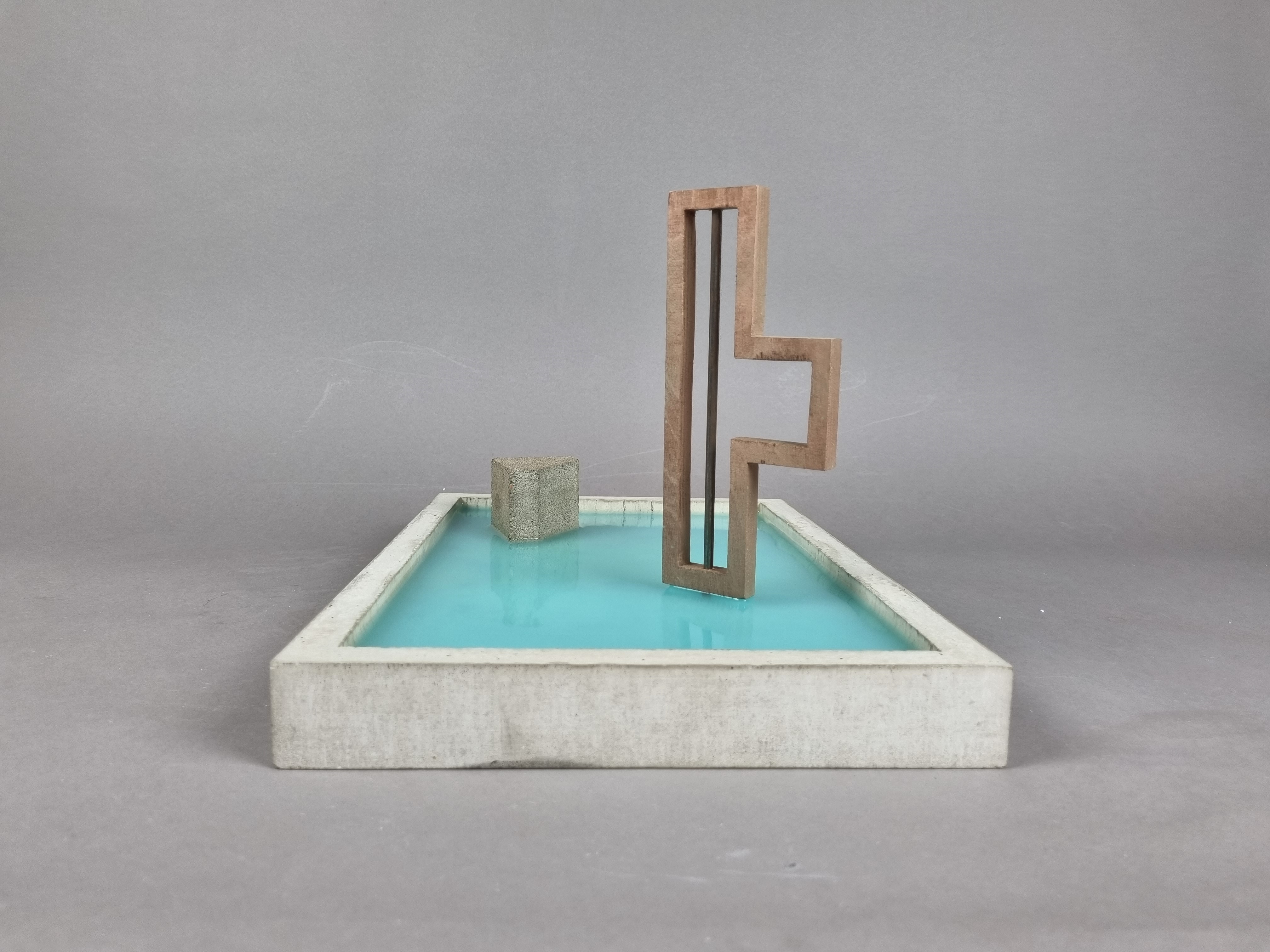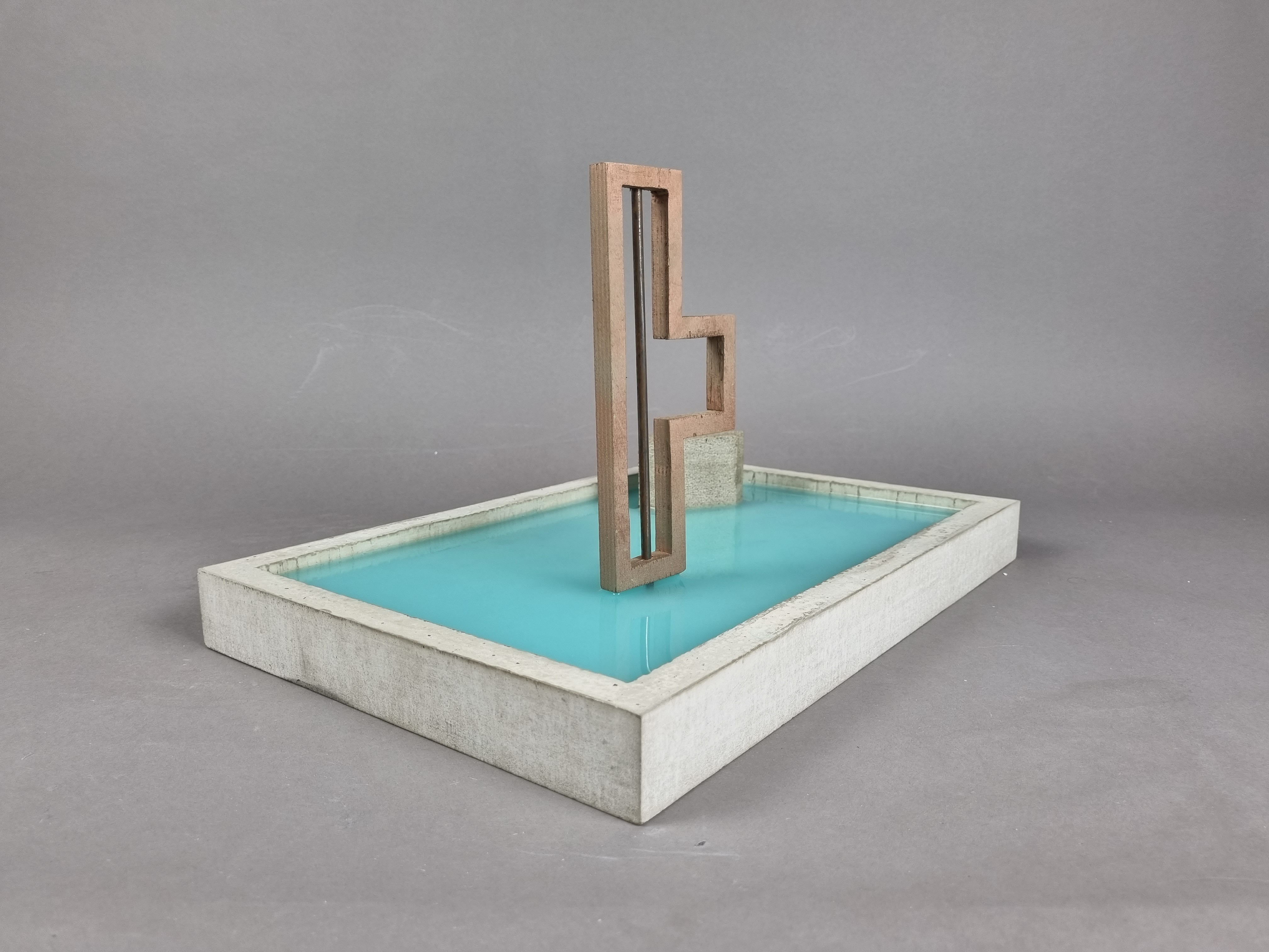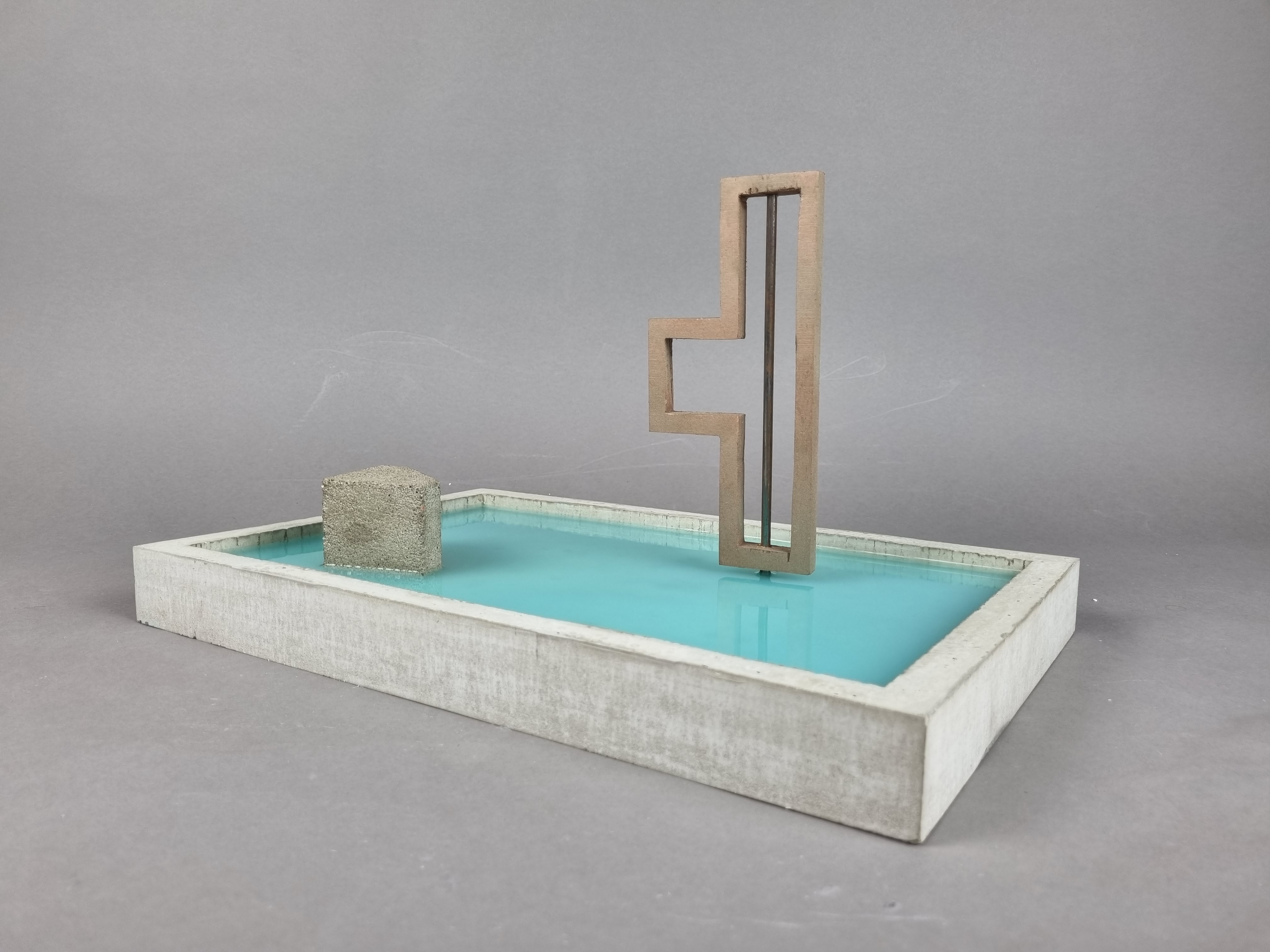 Carlo Scarpa is the architect behind the modern renovation of the garden and part of the ground floor for the Venetian institution Querini Stampalia. Scarpa is admired for his balanced combination of old and new elements, as well as on a great workmanship of the materials. This model represents the concept of the building. The purpose being to capture the feeling of the building, of the materials, elements and of how Scarpa is allowing the water to take its place. The model is made from concrete, a material widely used in the renovation of Palazzo Querini Stampalia. The two elements placed in the pool of water represent two objects found important and significant, the first one being the staircase leading down to the water and the second one being an abstract version of the iron gates.