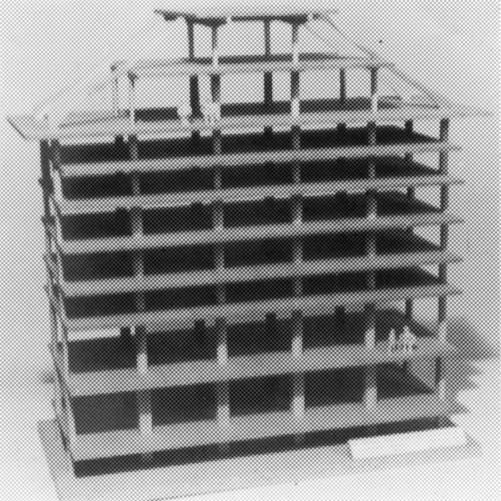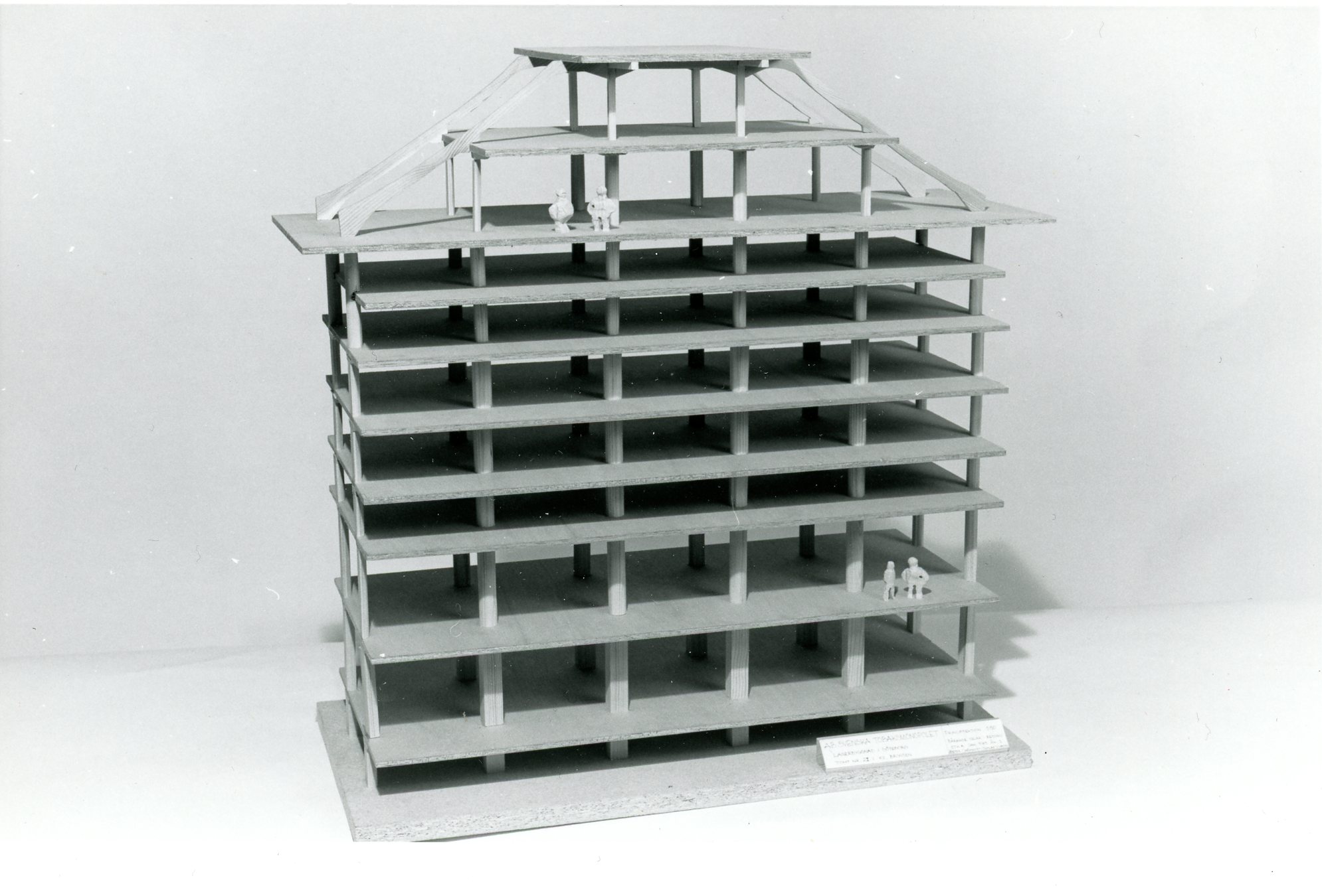 Modellen visar en sektion av Tobaksmonopolets lagerbyggnad i Göteborg. Med källaren innehåller byggnaden sex bjälklag som gjutits som pelardäck. I två av dessa våningar finns mellanbjälklag av stålkonstruktioner. Invändigt är pelarna, med 6 m centrummått i längdled och 5,4 m på bredden, kvadratiska eller runda. I fasaden är pelarna halverade. Bottenplattan består av 80 cm tjock armerad betong. Takstolen är från takfoten till ca 2/3 av betong. Den övre delen är av trä.