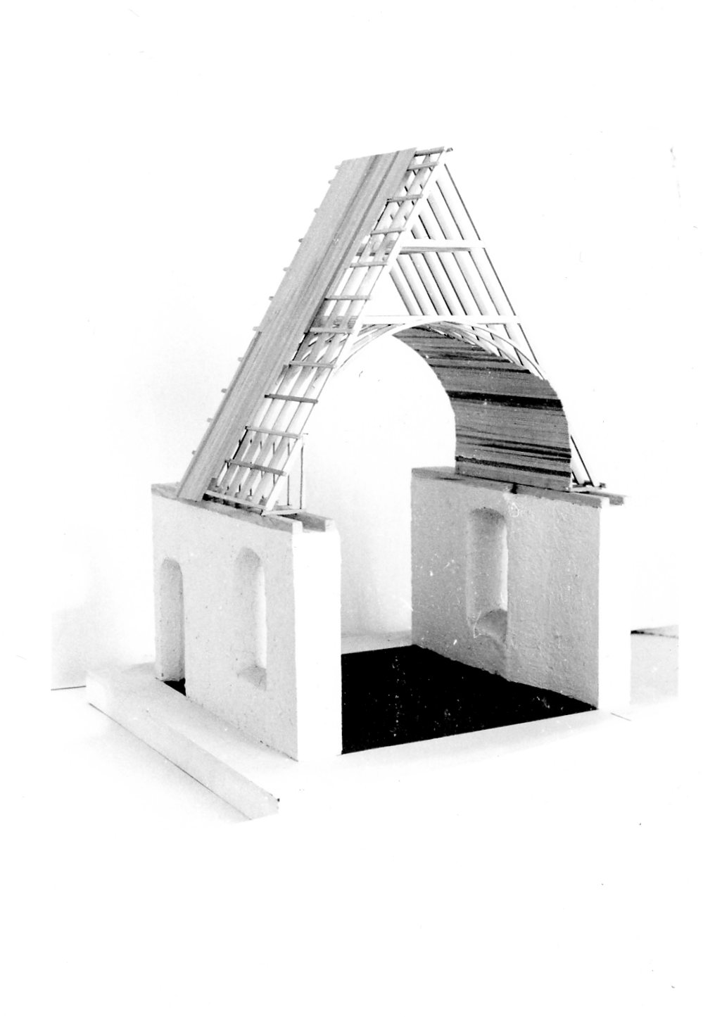 Modellen visar takstolen till den romanska stenkyrkan. Innertaket utgörs av ett trävalv.