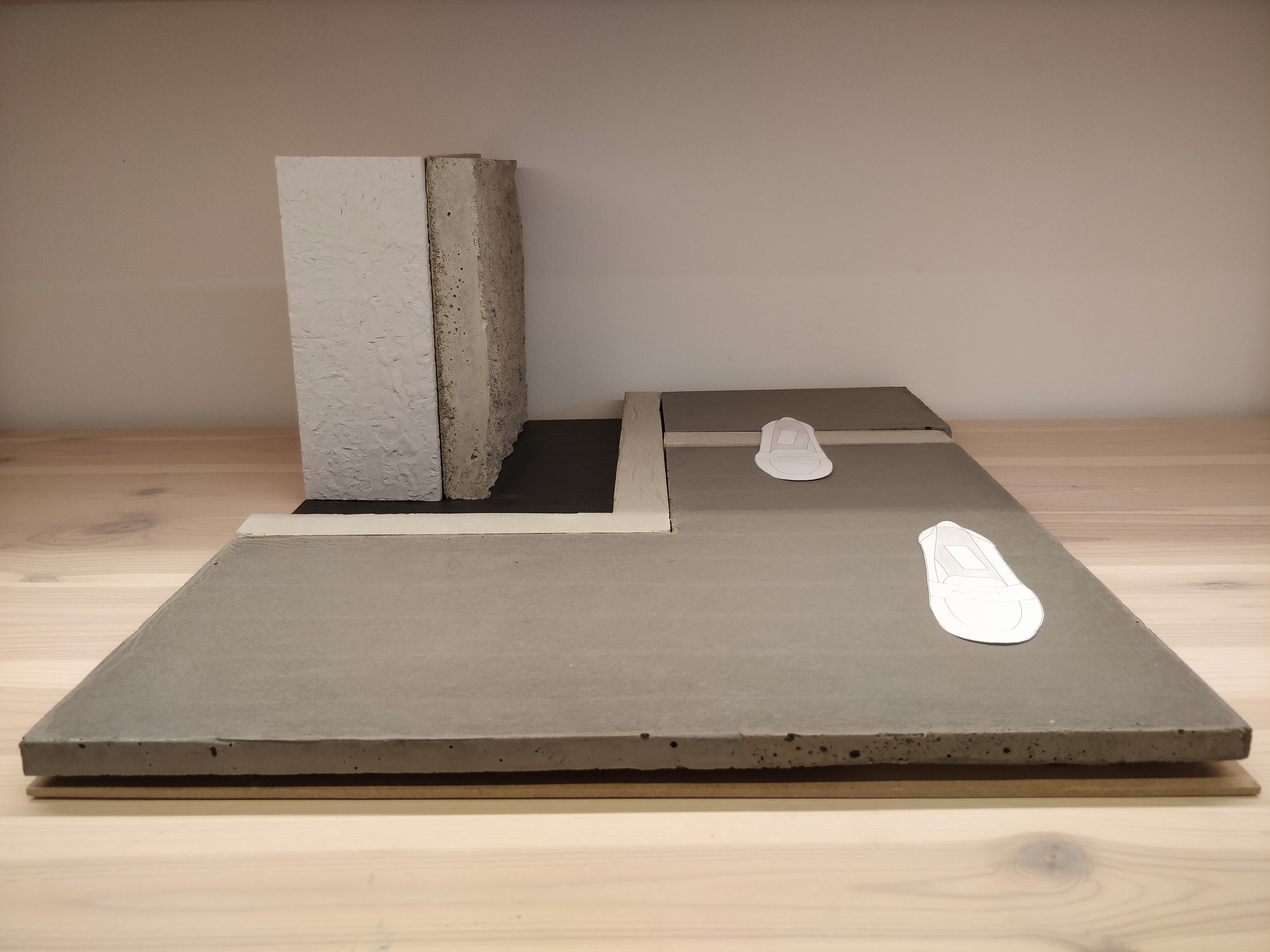 Gjuten betong för de nya golvets dela också för väggen i samband med spakel på ytan och trä för det gammla golvet.